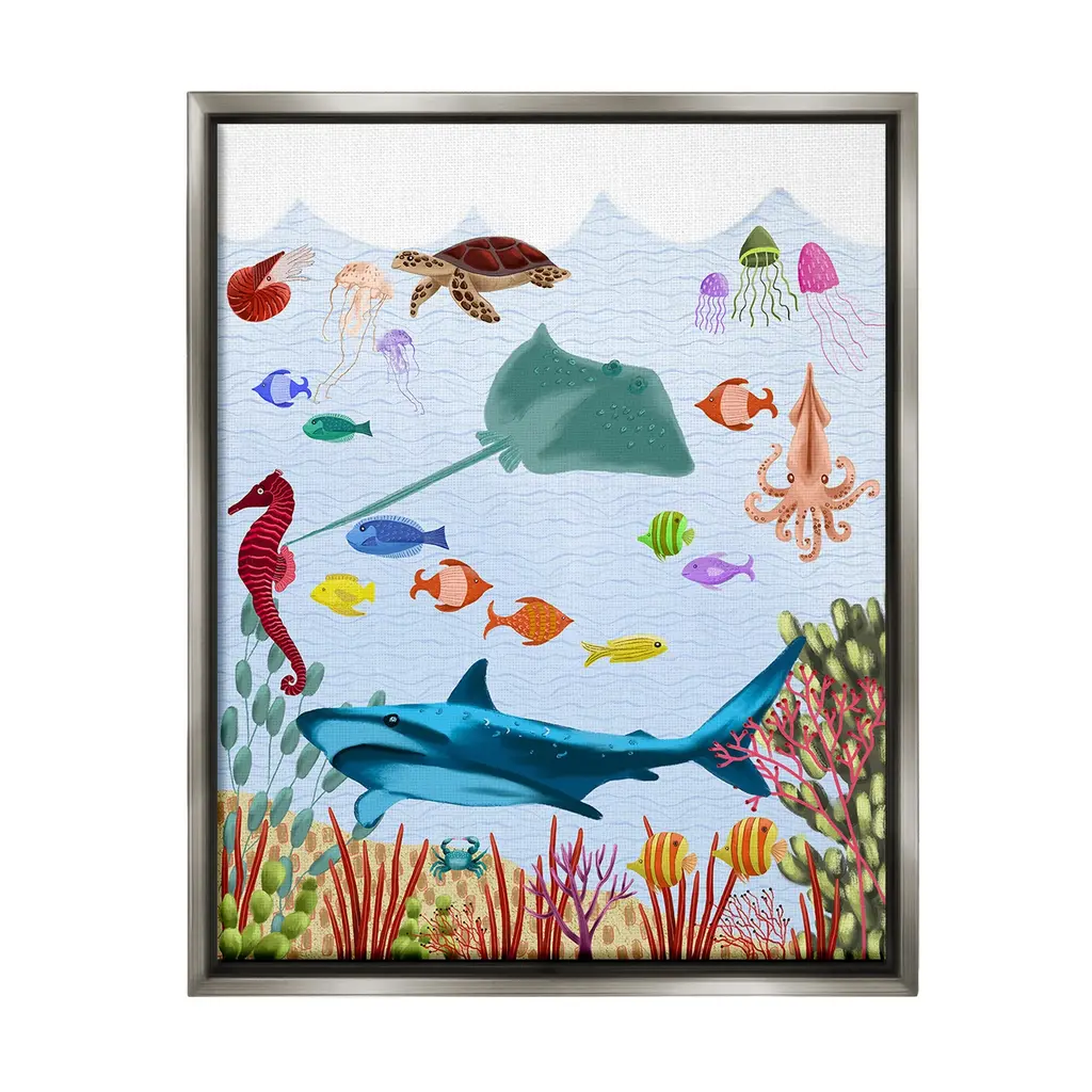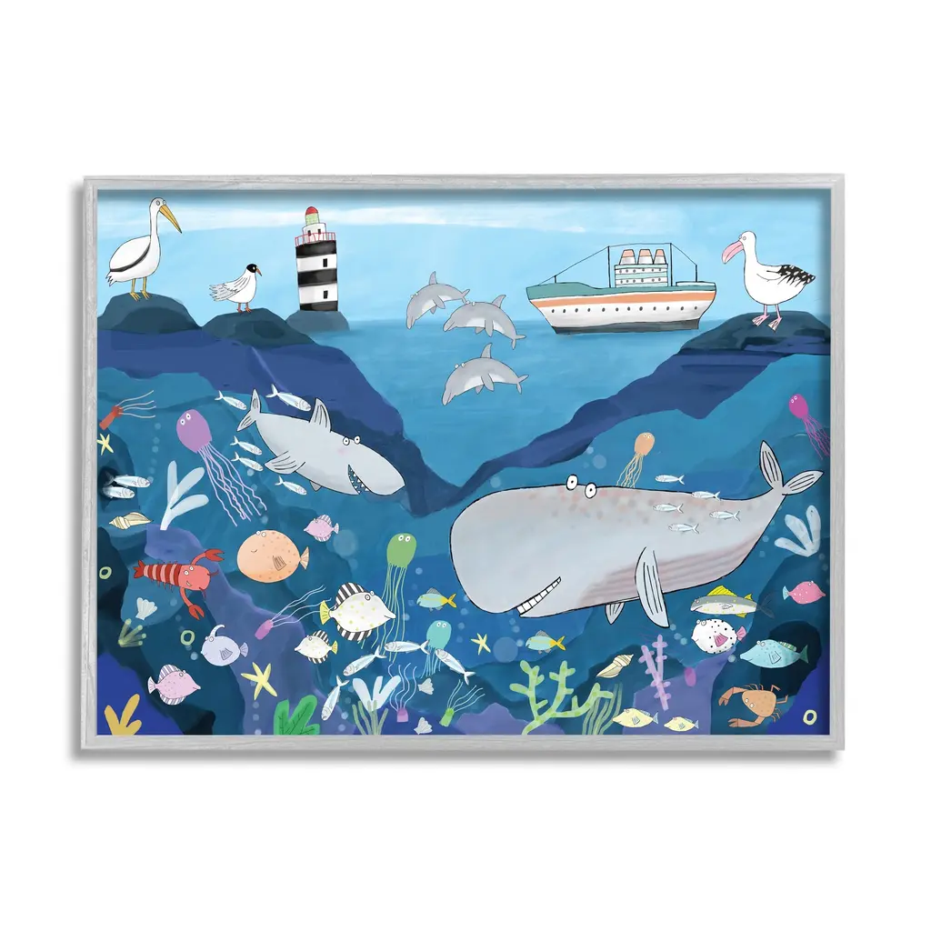 Stupell Underwater Wildlife Kid's Illustration Shark Whale Boat Framed Wall Art - 11 X 14 - White