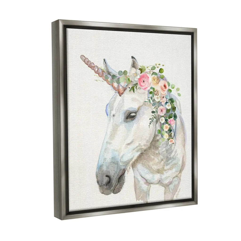 Elevate your home or office to the next level with Stupell Framed Floating Canvas Wall Art. Our premium hand-stretched canvas is mounted securely into a sturdy lightweight frame. The museum-style gap between the wrapped canvas and the box frame gives the illusion of floating artwork. Stupell Wall Art is made in the USA.Features: Dimensions: 17 x 1.7 x 21 Frame, 16 x 1.5 x 20 Canvas ArtFloating Frame Canvas Products are available in sizes 17"x21" and 25"x31". All Floating Frame Canvas Products have a 1.7" Depth.Wall Art is Ready to Hang with Hardware Free Hanging. No Installation required. For Easy Set Up Lean or Layer Artwork on Shelf or Against Wall. Artwork is Permently Fixed into the Frame.Our elevated 1.7" Thick Floating Frame is the perfect complement to our canvas style Wall Art. We use only the highest quality inks in house with industry leading printing solutions. Canvas is hand stretched over a durable wood foundation and then mounted securly into a Modern Box Frame. Made in the USA.Artwork Relates To: Animal, Mammal, Flower, Floral, Horse, Farmhouse, Unicorn, Rose, GarlandDesign by Jennifer Redstreake