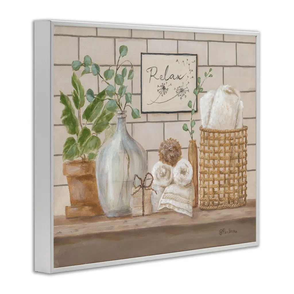 Our Framed Giclee Wall Art adds a touch of class to any space in your home or office. Frames are available in three alluring styles: black, gray farmhouse and white. Our textured artwork will add more depth and dimension to any space. Each piece is mounted with a 1.5 inch thick wood grain frame that is ready to hang! Looking for a statement piece? We have oversized artwork available.Features:Framed Giclee Sizes IncludeStandard: 14 x 1.5 x 11Large: 20 x 1.5 x 16Oversized: 30 x 1.5 x 24Wall Art is Ready to Hang - No Installation or Hardware Needed. For Easy Set Up Lean or Layer Artwork on Shelf or Against Wall.Artwork Relates To: Basket, Plant, Towel, Bath Towel, Indoors, Still Life, Let it all goOur giclee prints are carefully mounted on a durable MDF backing, and then perfectly finished in a 1.5 inch thick woodgrain frame. Mounted frame colors include black, gray farmhouse and white. Made In USA.Design by Pam Britton