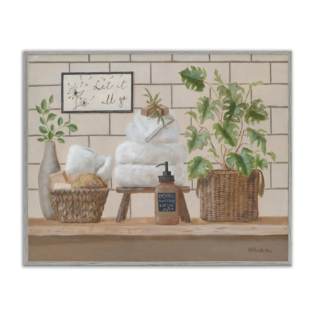 Our Framed Giclee Wall Art adds a touch of class to any space in your home or office. Frames are available in three alluring styles: black, gray farmhouse and white. Our textured artwork will add more depth and dimension to any space. Each piece is mounted with a 1.5 inch thick wood grain frame that is ready to hang! Looking for a statement piece? We have oversized artwork available.Features:Framed Giclee Sizes IncludeStandard: 14 x 1.5 x 11Large: 20 x 1.5 x 16Oversized: 30 x 1.5 x 24Wall Art is Ready to Hang - No Installation or Hardware Needed. For Easy Set Up Lean or Layer Artwork on Shelf or Against Wall.Artwork Relates To: Basket, Plant, Towel, Bath Towel, Indoors, Still Life, Let it all goOur giclee prints are carefully mounted on a durable MDF backing, and then perfectly finished in a 1.5 inch thick woodgrain frame. Mounted frame colors include black, gray farmhouse and white. Made In USA.Design by Pam Britton