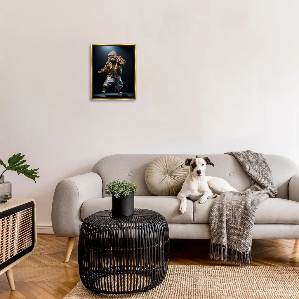 Elevate your home or office to the next level with Stupell Framed Floating Canvas Wall Art. Our premium hand-stretched canvas is mounted securely into a sturdy lightweight frame. The museum-style gap between the wrapped canvas and the box frame gives the illusion of floating artwork. Stupell Wall Art is made in the USA.Features: Dimensions: 17 x 1.7 x 21 Frame, 16 x 1.5 x 20 Canvas ArtFloating Frame Canvas Products are available in sizes 17"x21" and 25"x31". All Floating Frame Canvas Products have a 1.7" Depth.Wall Art is Ready to Hang with Hardware Free Hanging. No Installation required. For Easy Set Up Lean or Layer Artwork on Shelf or Against Wall. Artwork is Permently Fixed into the Frame.Our elevated 1.7" Thick Floating Frame is the perfect complement to our canvas style Wall Art. We use only the highest quality inks in house with industry leading printing solutions. Canvas is hand stretched over a durable wood foundation and then mounted securly into a Modern Box Frame. Made in the USA.Artwork Relates To: Jacket, Performer, Animal, Cat, Mammal, Pet, Dancing, Fashion, UrbanDesign by RB