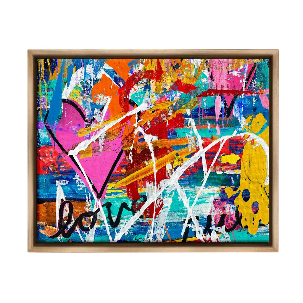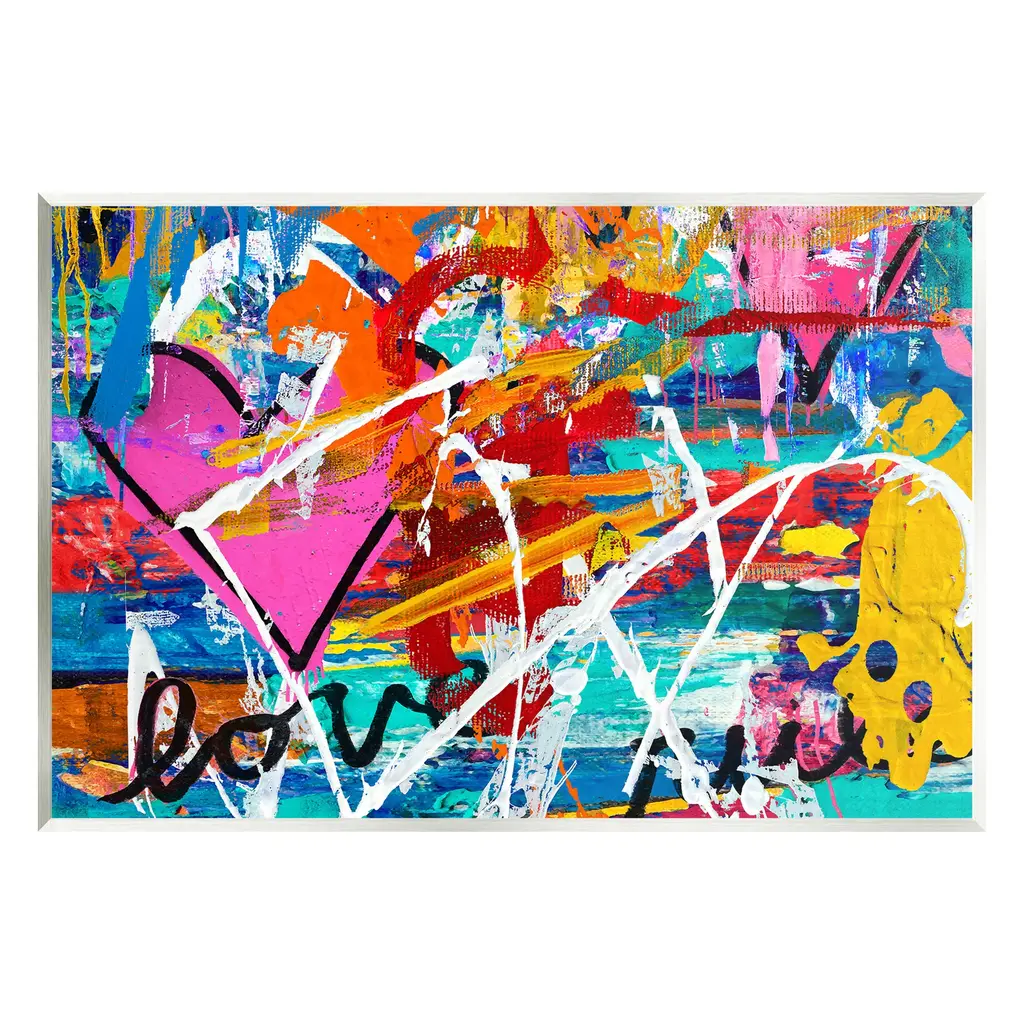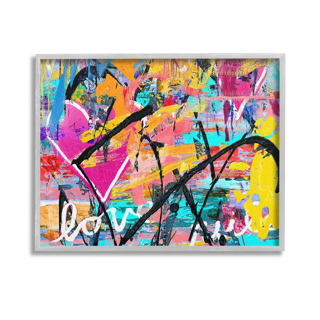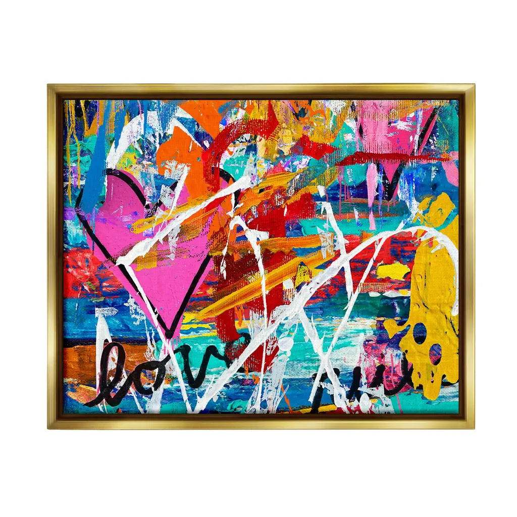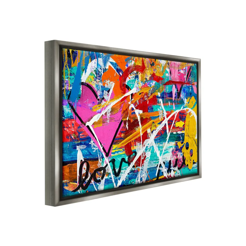 Elevate your home or office to the next level with Stupell Framed Floating Canvas Wall Art. Our premium hand-stretched canvas is mounted securely into a sturdy lightweight frame. The museum-style gap between the wrapped canvas and the box frame gives the illusion of floating artwork. Stupell Wall Art is made in the USA.Features: Dimensions: 21 x 1.7 x 17 Frame, 20 x 1.5 x 16 Canvas ArtFloating Frame Canvas Products are available in sizes 21"x17" and 31"x25". All Floating Frame Canvas Products have a 1.7" Depth.Wall Art is Ready to Hang with Hardware Free Hanging. No Installation required. For Easy Set Up Lean or Layer Artwork on Shelf or Against Wall. Artwork is Permently Fixed into the Frame.Our elevated 1.7" Thick Floating Frame is the perfect complement to our canvas style Wall Art. We use only the highest quality inks in house with industry leading printing solutions. Canvas is hand stretched over a durable wood foundation and then mounted securly into a Modern Box Frame. Made in the USA.Artwork Relates To: Abstract, Modern, Urban, Graffiti, Heart, Symbol, Love, Collage, Bold, VividDesign by Madeline Blake