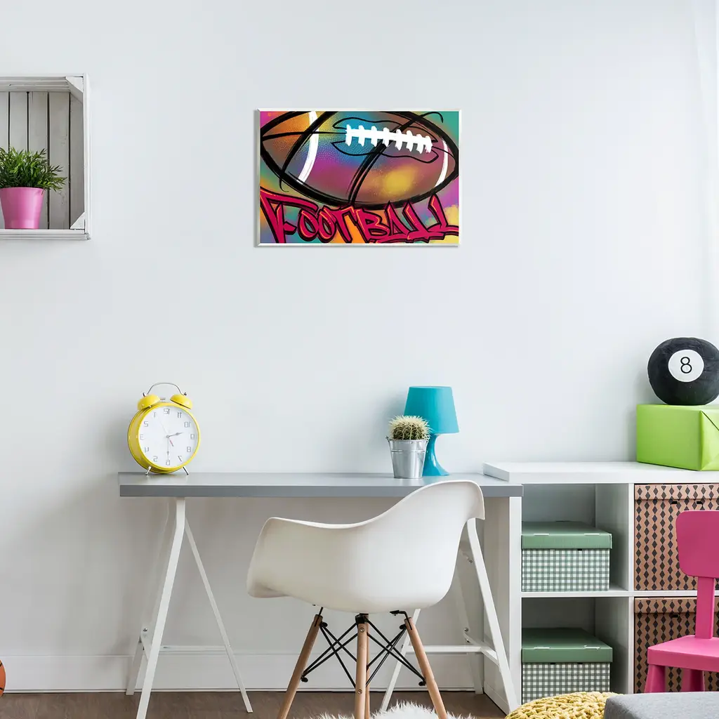 Our wall plaques start as high-quality lithograph prints mounted on durable 0.5-inch thick MDF wood. Each piece is hand finished and comes with a fresh layer of white foil on the sides to give it a crisp, clean look. Plaques arrive ready to hang without installation and come with removable plastic corners to keep them from damage in transit. Wall Art is made in the USA.Features: Dimensions: 15 x 0.5 x 10 InchesWall Plaque Sizes Include Standard: 15 x 0.5 x 10 Oversized: 19 x 0.5 x 13Wall Art is Ready to Hang with Hardware Free Hanging. No installation required. For Easy Set Up Lean or Layer Artwork on Shelf or Against Wall.All of our wall plaques start off as high quality lithograph prints that are then mounted on durable 0.5 inch thick MDF wood. Each piece is hand finished and comes with a fresh layer of foil on the sides to give it a crisp clean look. Made In USA.Artwork Relates To: Urban, Abstract, Modern, Sports, FootballDesign by Marcus Prime