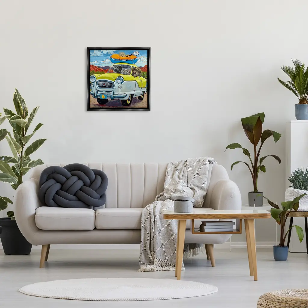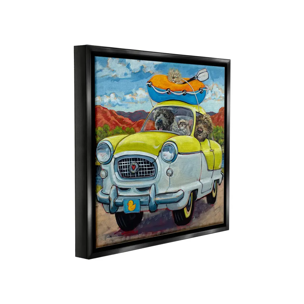 Elevate your home or office to the next level with Stupell Framed Floating Canvas Wall Art. Our premium hand-stretched canvas is mounted securely into a sturdy lightweight frame. The museum-style gap between the wrapped canvas and the box frame gives the illusion of floating artwork. Stupell Wall Art is made in the USA.Features: Dimensions: 18 x 1.7 x 18 Frame, 17 x 1.5 x 17 Canvas ArtFloating Frame Canvas Products are available in sizes 18"x18" and 25"x25". All Floating Frame Canvas Products have a 1.7" Depth.Wall Art is Ready to Hang with Hardware Free Hanging. No Installation required. For Easy Set Up Lean or Layer Artwork on Shelf or Against Wall. Artwork is Permently Fixed into the Frame.Our elevated 1.7" Thick Floating Frame is the perfect complement to our canvas style Wall Art. We use only the highest quality inks in house with industry leading printing solutions. Canvas is hand stretched over a durable wood foundation and then mounted securly into a Modern Box Frame. Made in the USA.Artwork Relates To: Painting, Animal, Canine, Dog, Mammal, Pet, Car, Modern, Landscape, Raft, Boat, Vacation, Desert, SummerDesign by CR Townsend