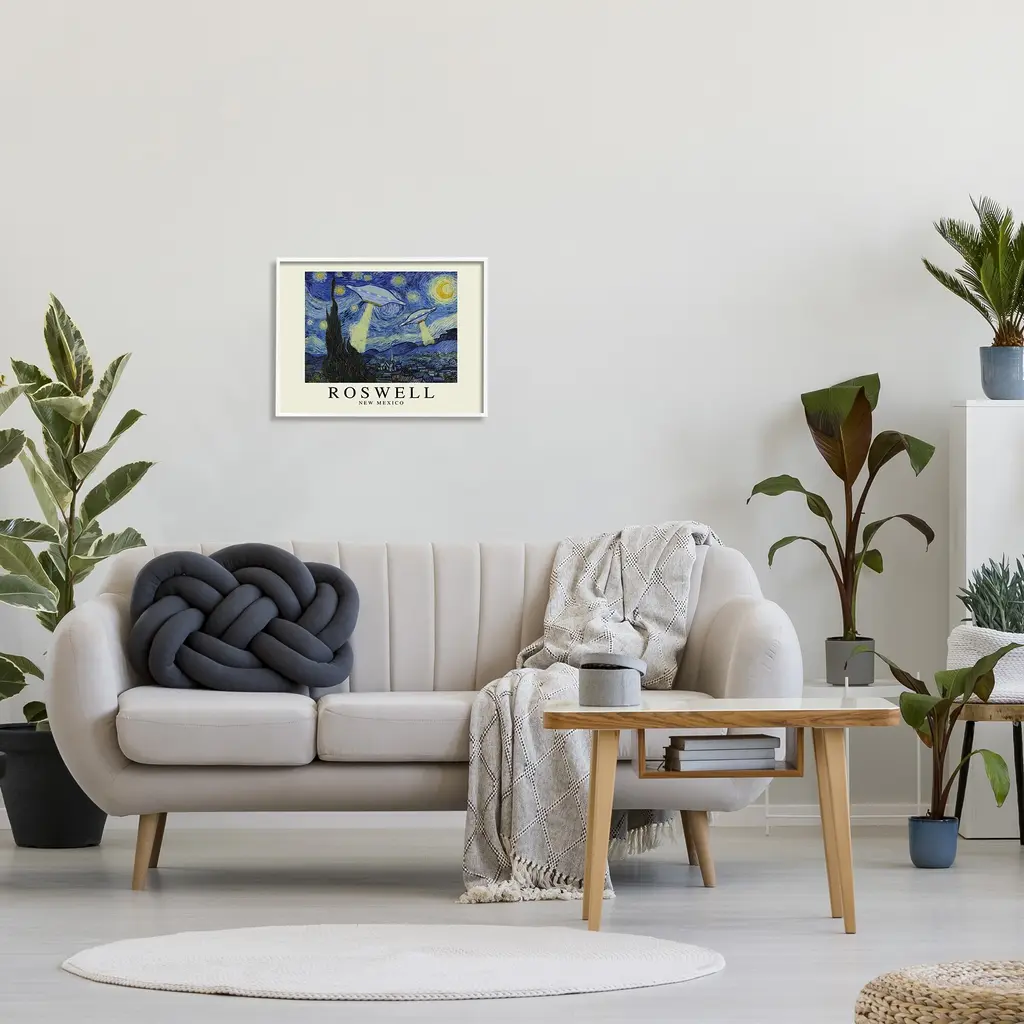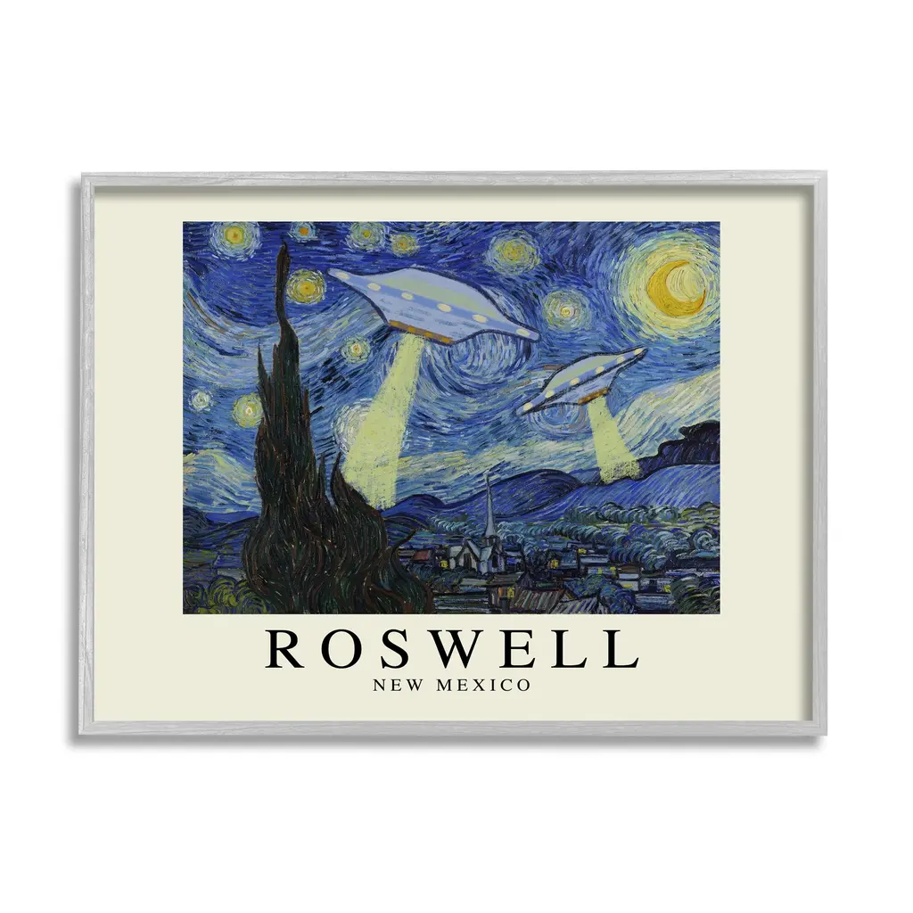 Add dimension to any room with our textured Framed Giclee Artwork. Our framed artwork is securely mounted into a 1.5-inch thick wood grain frame and ready to hang. Frames are available in three alluring styles: black, gray farmhouse and white. In addition, you should check out our oversized options if you want a statement piece. Stupell Wall Art is made in the USA.Features: Dimensions: 14 x 1.5 x 11 FramedFramed Giclee Sizes Include Standard: 14 x 1.5 x 11 Large: 20 x 1.5 x 16 Oversized: 30 x 1.5 x 24Wall Art is Ready to Hang - No Installation or Hardware Needed. For Easy Set Up Lean or Layer Artwork on Shelf or Against Wall.Our giclée prints are carefully mounted on a durable MDF backing, and then perfectly finished in a 1.5 inch thick woodgrain frame. Mounted frame colors include black, gray farmhouse and white. Made In USA.Artwork Relates To: Van Gogh, Classic, Painting, Funny, Humor, Roswell New MexicoDesign by Lil' Rue
