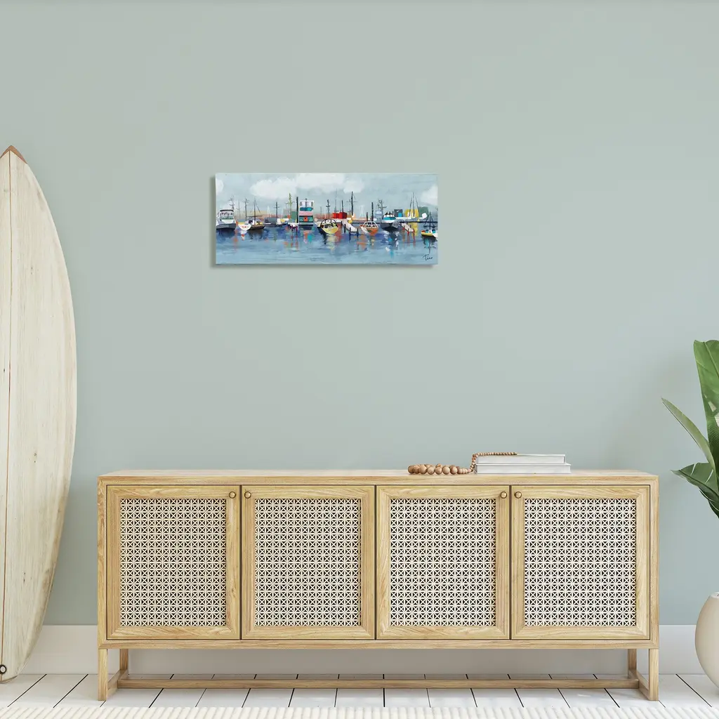 Proudly made in the USA, Our stretched canvas is created with the highest standards. We use only the highest quality inks and canvas on our in house Mimaki printers, and then hand cut and stretch each piece over a 1.5 inch thick wooden frame for hanging. The art comes ready to hang with no installation required. Not to mention, at this size, it is sure to be the focal point of any room!Features: Wall Art is Ready to Hang - No Installation or Hardware Needed. For Easy Set Up Lean or Layer Artwork on Shelf or Against Wall.Our stretched canvas is created with the highest standards. We use only the highest quality inks and canvas on our in house Mimaki printers, and then hand cut and stretch each piece over a 1.5 inch thick wooden frame for hanging. Made In USA.Artwork Relates To: Water; Boat; Waterfront; Sea; Ocean; Pier; Port; Dock; Watercraft; VesselDesign by Tina Finn