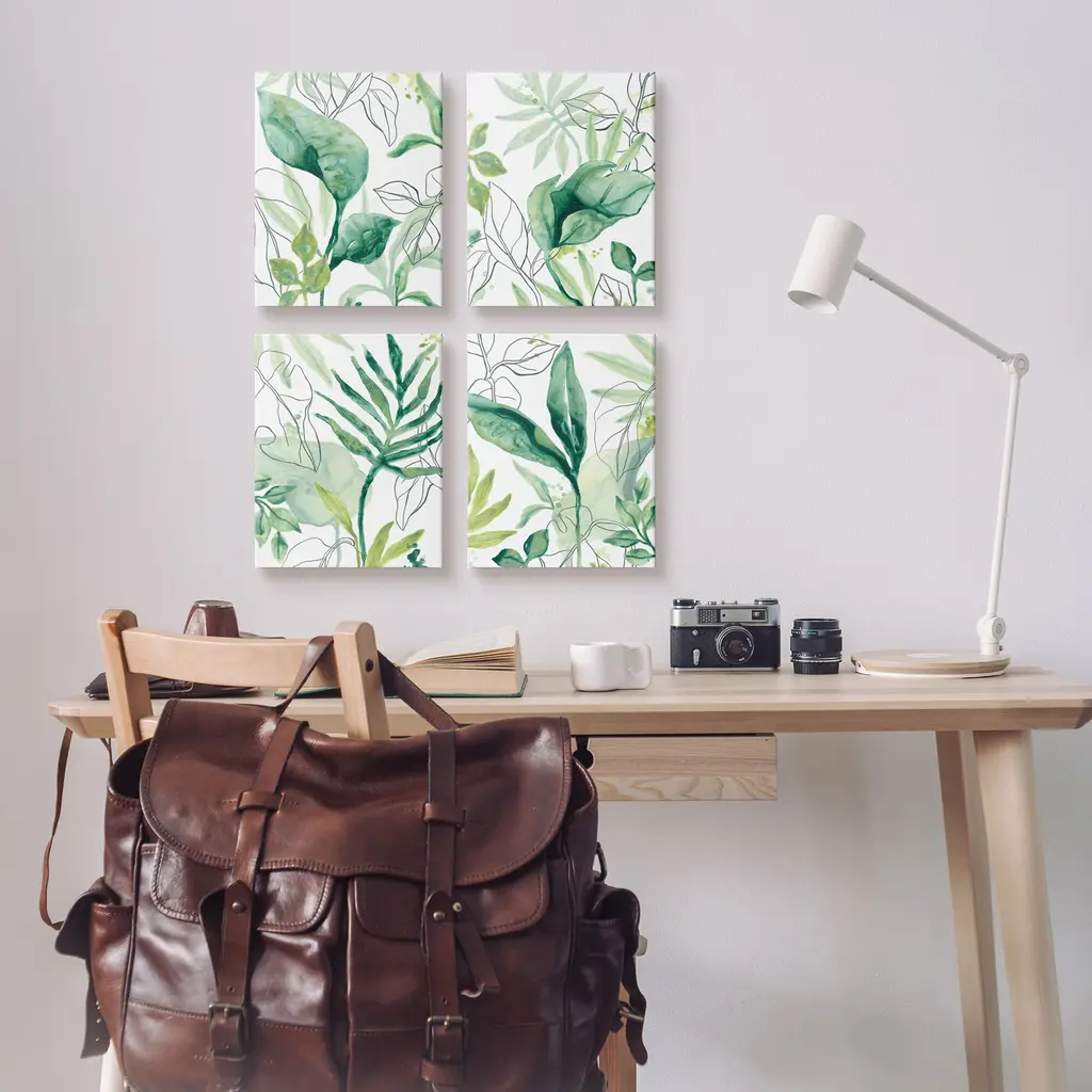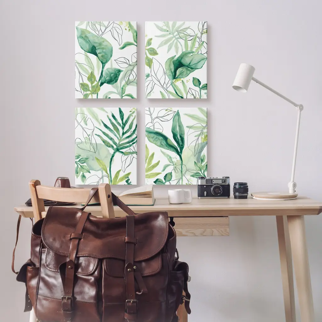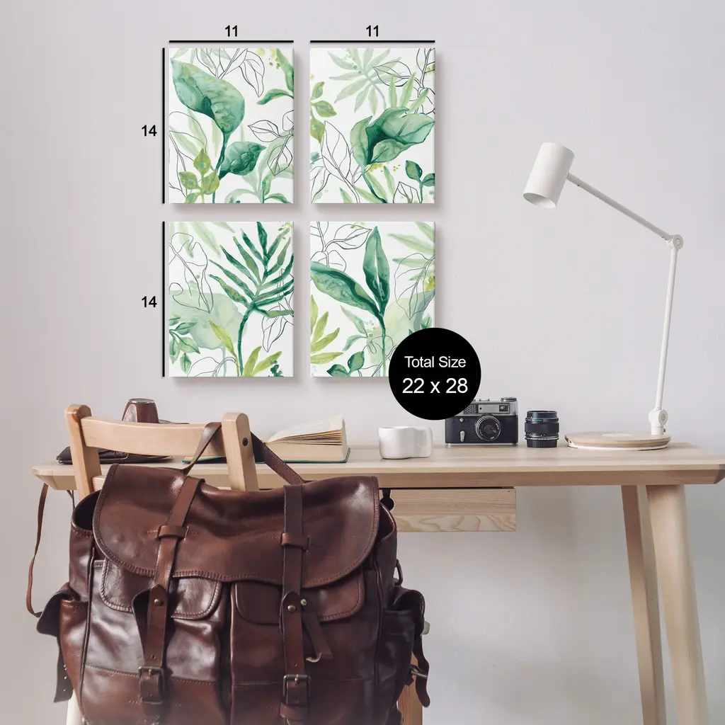 Fill any space with Stupell Wall Art Sets. We create our stretched canvas to the highest standards. Using only the highest quality inks and canvas on Mimaki printers, we hand-cut and stretch each piece over a 1.5-inch thick wooden frame for hanging. As a result, the art comes ready to hang on the sturdy ledge with no installation required. Stupell Wall Art is made in the USA.Features: Dimensions: 4 Piece Set, Each Panel is 11 x 1.5 x 14 InchesFour Piece Canvas Set Sizes Include Standard: 4pc, Each is 11 x 1.5 x 14 Large: 4pc, Each is 16 x 1.5 x 20Wall Art is Ready to Hang - No Installation or Hardware Needed. For Easy Set Up Lean or Layer Artwork on Shelf or Against Wall.Our stretched canvas is created with the highest standards. We use only the highest quality inks and canvas on our in house Mimaki printers, and then hand cut and stretch each piece over a 1.5 inch thick wooden frame for hanging. Made In USA.Artwork Relates To: Plant, Leaf, Tropical, Green, OutlinesDesign by June Erica Vess