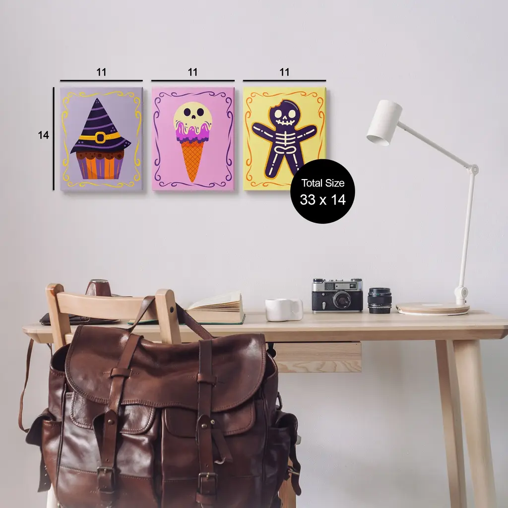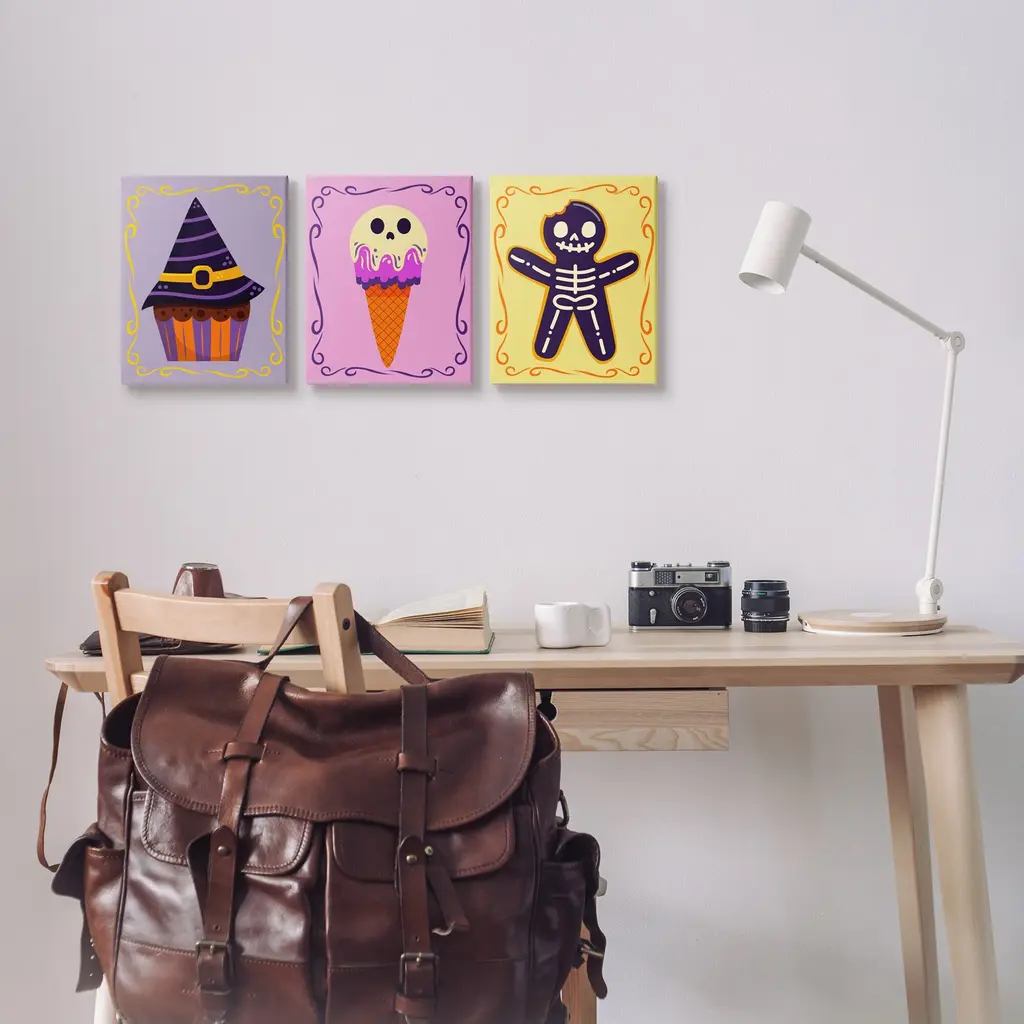 Fill any space with Stupell Wall Art Sets. We create our stretched canvas to the highest standards. Using only the highest quality inks and canvas on Mimaki printers, we hand-cut and stretch each piece over a 1.5-inch thick wooden frame for hanging. As a result, the art comes ready to hang on the sturdy ledge with no installation required. Stupell Wall Art is made in the USA.Features: Dimensions: 3 Piece Set, Each Panel is 11 x 1.5 x 14 InchesThree Piece Canvas Set Sizes Include Standard: 3pc, Each is 11 x 1.5 x 14 Large: 3pc, Each is 16 x 1.5 x 20 Oversized: 3pc, Each is 24 x 1.5 x 30Wall Art is Ready to Hang with Hardware Free Hanging. No installation required. For Easy Set Up Lean or Layer Artwork on Shelf or Against Wall.Our stretched canvas is created with the highest standards. We use only the highest quality inks and canvas on our in house Mimaki printers, and then hand cut and stretch each piece over a 1.5 inch thick wooden frame for hanging. Made In USA.Artwork Relates To: Halloween, Ice Cream, Food, Skeleton, CookieDesign by Lil' Rue