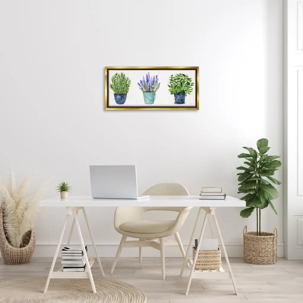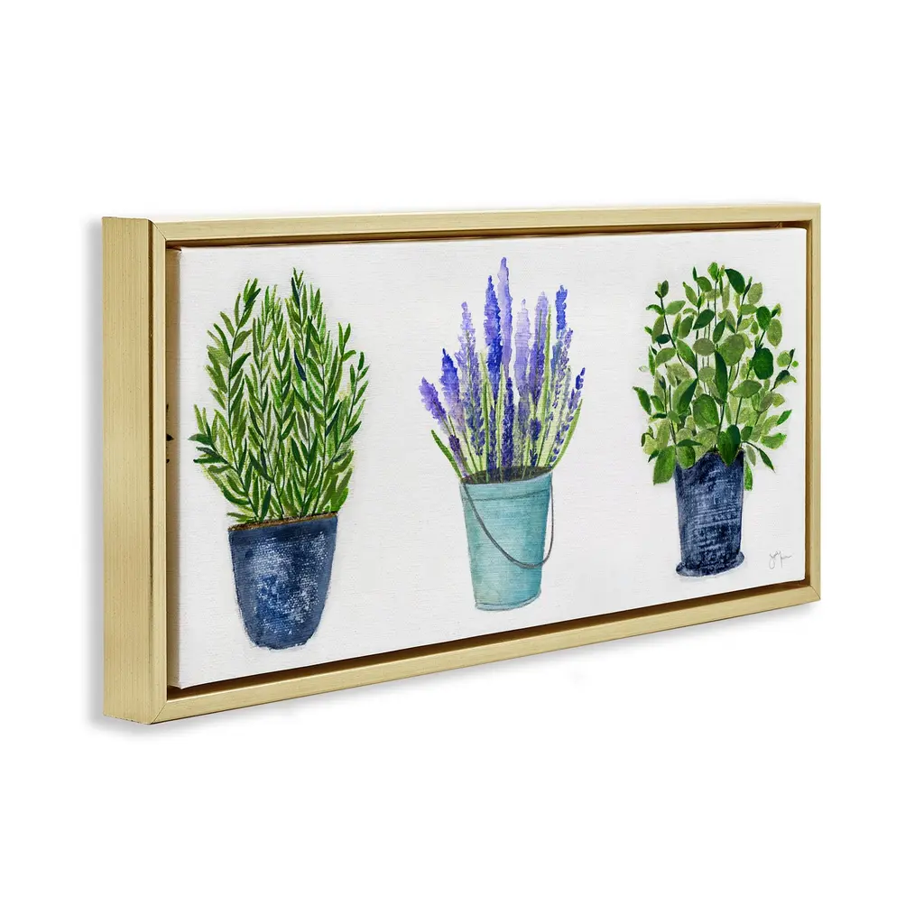 Elevate your home or office to the next level with Stupell Framed Floating Canvas Wall Art. Our premium hand-stretched canvas is mounted securely into a sturdy lightweight frame. The museum-style gap between the wrapped canvas and the box frame gives the illusion of floating artwork. Stupell Wall Art is made in the USA.Features: Dimensions: 25 x 1.7 x 11 Frame, 24 x 1.5 x 10 Canvas ArtFloating Frame Canvas Products are available in sizes 25"x11" and 31"x14". All Floating Frame Canvas Products have a 1.7" Depth.Wall Art is Ready to Hang with Hardware Free Hanging. No Installation required. For Easy Set Up Lean or Layer Artwork on Shelf or Against Wall. Artwork is Permently Fixed into the Frame.Our elevated 1.7" Thick Floating Frame is the perfect complement to our canvas style Wall Art. We use only the highest quality inks in house with industry leading printing solutions. Canvas is hand stretched over a durable wood foundation and then mounted securly into a Modern Box Frame. Made in the USA.Artwork Relates To: Potted Plant, Plant, Herbs, Flower, Botanical, CountryDesign by Janet Tava