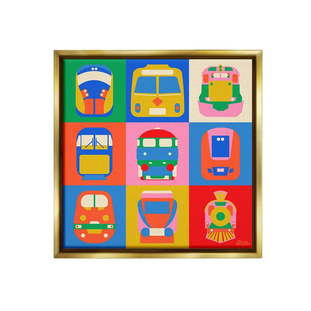 Elevate your home or office to the next level with Stupell Framed Floating Canvas Wall Art. Our premium hand-stretched canvas is mounted securely into a sturdy lightweight frame. The museum-style gap between the wrapped canvas and the box frame gives the illusion of floating artwork. Stupell Wall Art is made in the USA.Features: Dimensions: 18 x 1.7 x 18 Frame, 17 x 1.5 x 17 Canvas ArtFloating Frame Canvas Products are available in sizes 18"x18" and 25"x25". All Floating Frame Canvas Products have a 1.7" Depth.Wall Art is Ready to Hang with Hardware Free Hanging. No Installation required. For Easy Set Up Lean or Layer Artwork on Shelf or Against Wall. Artwork is Permently Fixed into the Frame.Our elevated 1.7" Thick Floating Frame is the perfect complement to our canvas style Wall Art. We use only the highest quality inks in house with industry leading printing solutions. Canvas is hand stretched over a durable wood foundation and then mounted securly into a Modern Box Frame. Made in the USA.Artwork Relates To: Transportation, Vehicle, Bus, Train, Tram, Pattern, Modern, AbstractDesign by Carrie Cantwell