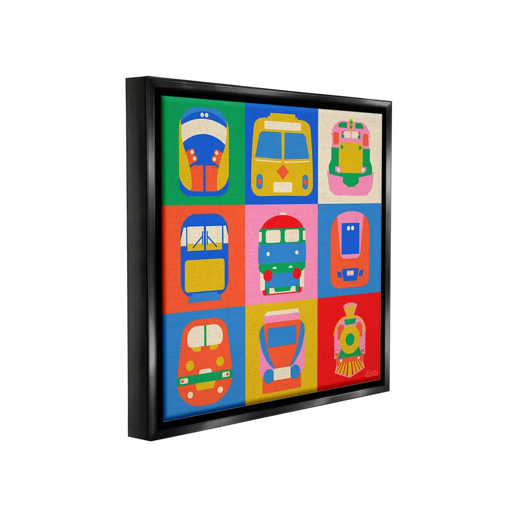 Elevate your home or office to the next level with Stupell Framed Floating Canvas Wall Art. Our premium hand-stretched canvas is mounted securely into a sturdy lightweight frame. The museum-style gap between the wrapped canvas and the box frame gives the illusion of floating artwork. Stupell Wall Art is made in the USA.Features: Dimensions: 18 x 1.7 x 18 Frame, 17 x 1.5 x 17 Canvas ArtFloating Frame Canvas Products are available in sizes 18"x18" and 25"x25". All Floating Frame Canvas Products have a 1.7" Depth.Wall Art is Ready to Hang with Hardware Free Hanging. No Installation required. For Easy Set Up Lean or Layer Artwork on Shelf or Against Wall. Artwork is Permently Fixed into the Frame.Our elevated 1.7" Thick Floating Frame is the perfect complement to our canvas style Wall Art. We use only the highest quality inks in house with industry leading printing solutions. Canvas is hand stretched over a durable wood foundation and then mounted securly into a Modern Box Frame. Made in the USA.Artwork Relates To: Transportation, Vehicle, Bus, Train, Tram, Pattern, Modern, AbstractDesign by Carrie Cantwell