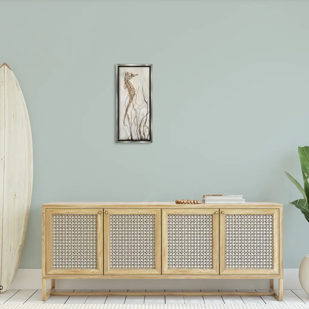 Elevate your home or office to the next level with Stupell Framed Floating Canvas Wall Art. Our premium hand-stretched canvas is mounted securely into a sturdy lightweight frame. The museum-style gap between the wrapped canvas and the box frame gives the illusion of floating artwork. Stupell Wall Art is made in the USA.Features: Dimensions: 11 x 1.7 x 25 Frame, 10 x 1.5 x 24 Canvas ArtFloating Frame Canvas Products are available in sizes 11"x25" and 14"x31". All Floating Frame Canvas Products have a 1.7" Depth.Wall Art is Ready to Hang with Hardware Free Hanging. No Installation required. For Easy Set Up Lean or Layer Artwork on Shelf or Against Wall. Artwork is Permently Fixed into the Frame.Our elevated 1.7" Thick Floating Frame is the perfect complement to our canvas style Wall Art. We use only the highest quality inks in house with industry leading printing solutions. Canvas is hand stretched over a durable wood foundation and then mounted securly into a Modern Box Frame. Made in the USA.Artwork Relates To: Animal, Sea Life, Conch, Seashell, Ocean, Beach, Tide, Waves, Nautical, Coastal, Sand, SeahorseDesign by Carol Robinson