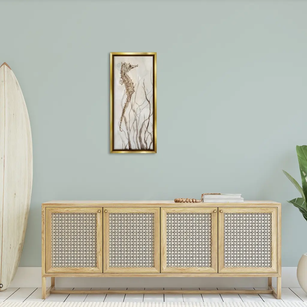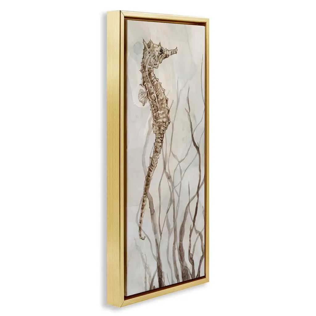 Elevate your home or office to the next level with Stupell Framed Floating Canvas Wall Art. Our premium hand-stretched canvas is mounted securely into a sturdy lightweight frame. The museum-style gap between the wrapped canvas and the box frame gives the illusion of floating artwork. Stupell Wall Art is made in the USA.Features: Dimensions: 11 x 1.7 x 25 Frame, 10 x 1.5 x 24 Canvas ArtFloating Frame Canvas Products are available in sizes 11"x25" and 14"x31". All Floating Frame Canvas Products have a 1.7" Depth.Wall Art is Ready to Hang with Hardware Free Hanging. No Installation required. For Easy Set Up Lean or Layer Artwork on Shelf or Against Wall. Artwork is Permently Fixed into the Frame.Our elevated 1.7" Thick Floating Frame is the perfect complement to our canvas style Wall Art. We use only the highest quality inks in house with industry leading printing solutions. Canvas is hand stretched over a durable wood foundation and then mounted securly into a Modern Box Frame. Made in the USA.Artwork Relates To: Animal, Sea Life, Conch, Seashell, Ocean, Beach, Tide, Waves, Nautical, Coastal, Sand, SeahorseDesign by Carol Robinson