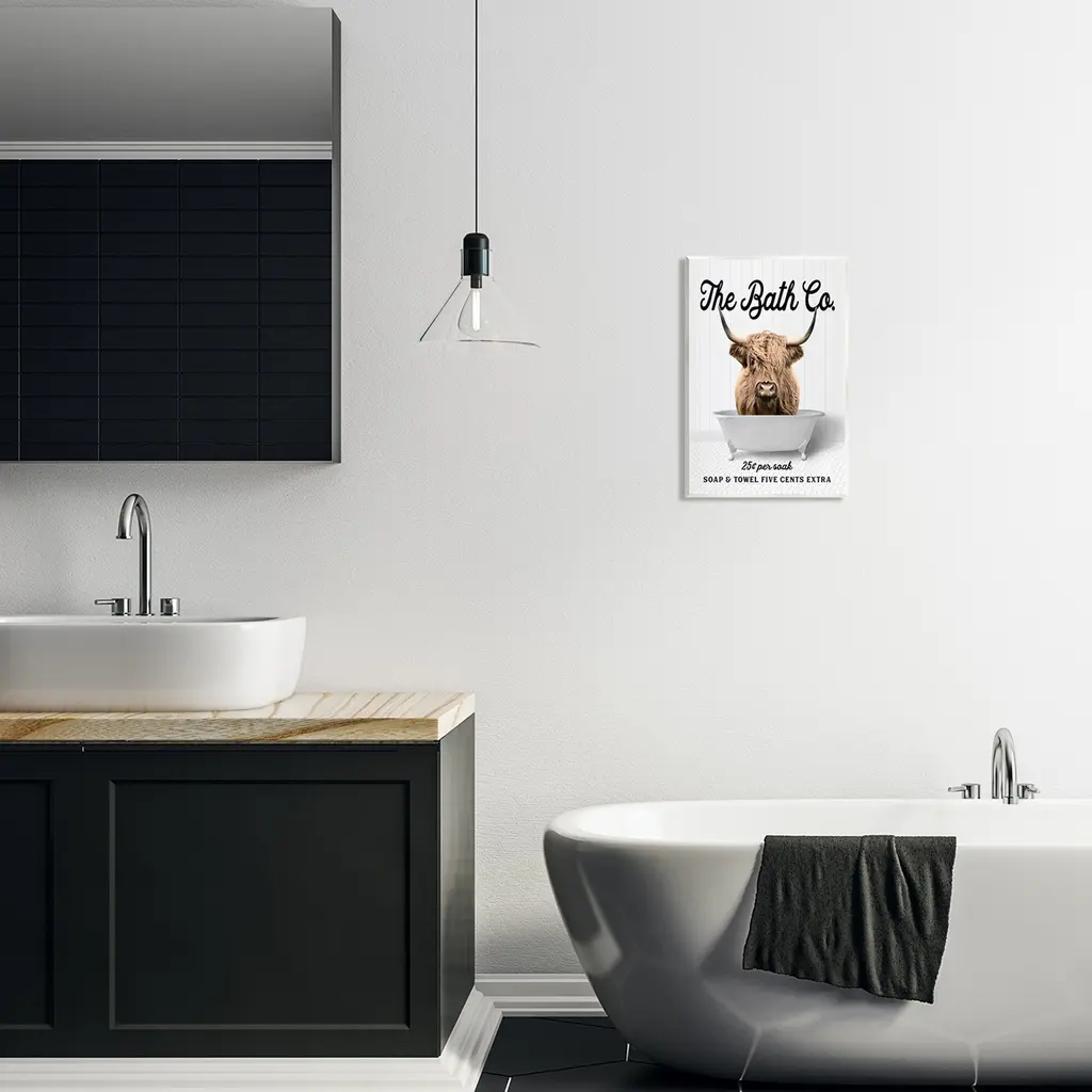 Our wall plaques start as high-quality lithograph prints mounted on durable 0.5-inch thick MDF wood. Each piece is hand finished and comes with a fresh layer of white foil on the sides to give it a crisp, clean look. Plaques arrive ready to hang without installation and come with removable plastic corners to keep them from damage in transit. Stupell Wall Art is made in the USA.Features: Dimensions: 10 x 0.5 x 15 InchesWall Plaque Sizes Include Standard: 10 x 0.5 x 15 Oversized: 13 x 0.5 x 19Wall Art is Ready to Hang with Hardware Free Hanging. No installation required. For Easy Set Up Lean or Layer Artwork on Shelf or Against Wall.All of our wall plaques start off as high quality lithograph prints that are then mounted on durable 0.5 inch thick MDF wood. Each piece is hand finished and comes with a fresh layer of foil on the sides to give it a crisp clean look. Made In USA.Artwork Relates To: Animal, Mammal, Bathroom, Bathtub, Phrase, Tub, Cattle, CowDesign by Lettered and Lined