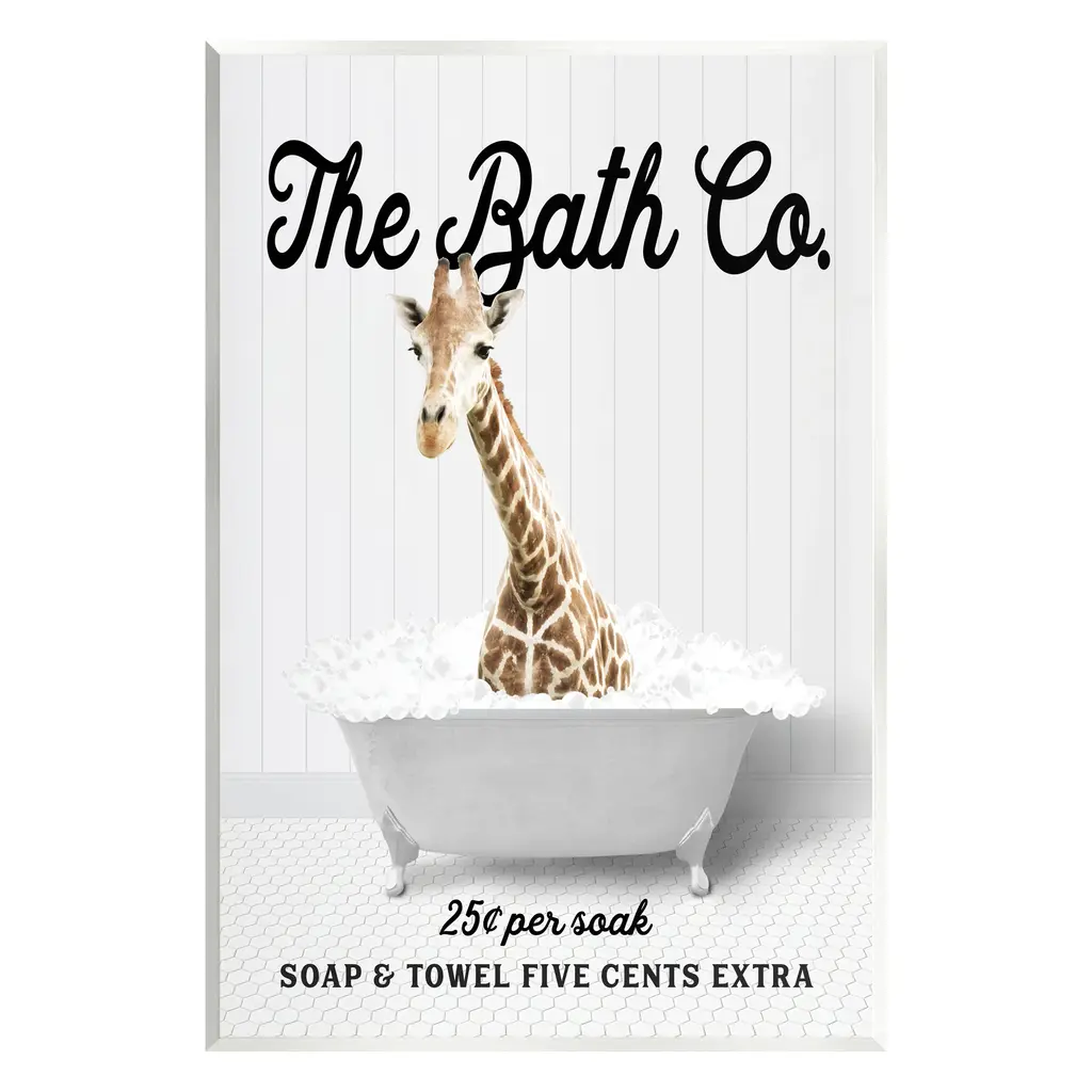 Our wall plaques start as high-quality lithograph prints mounted on durable 0.5-inch thick MDF wood. Each piece is hand finished and comes with a fresh layer of white foil on the sides to give it a crisp, clean look. Plaques arrive ready to hang without installation and come with removable plastic corners to keep them from damage in transit. Stupell Wall Art is made in the USA.Features: Dimensions: 10 x 0.5 x 15 InchesWall Plaque Sizes Include Standard: 10 x 0.5 x 15 Oversized: 13 x 0.5 x 19Wall Art is Ready to Hang with Hardware Free Hanging. No installation required. For Easy Set Up Lean or Layer Artwork on Shelf or Against Wall.All of our wall plaques start off as high quality lithograph prints that are then mounted on durable 0.5 inch thick MDF wood. Each piece is hand finished and comes with a fresh layer of foil on the sides to give it a crisp clean look. Made In USA.Artwork Relates To: Animal, Mammal, Bathroom, Bathtub, Phrase, Tub, GiraffeDesign by Lettered and Lined