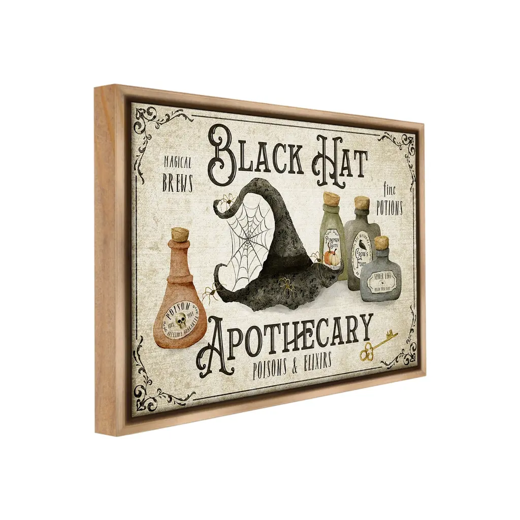 Elevate your home or office to the next level with Stupell Framed Floating Canvas Wall Art. Our premium hand-stretched canvas is mounted securely into a sturdy lightweight frame. The museum-style gap between the wrapped canvas and the box frame gives the illusion of floating artwork. Stupell Wall Art is made in the USA.Features: Dimensions: 21 x 1.7 x 17 Frame, 20 x 1.5 x 16 Canvas ArtFloating Frame Canvas Products are available in sizes 21"x17" and 31"x25". All Floating Frame Canvas Products have a 1.7" Depth.Wall Art is Ready to Hang with Hardware Free Hanging. No Installation required. For Easy Set Up Lean or Layer Artwork on Shelf or Against Wall. Artwork is Permently Fixed into the Frame.Our elevated 1.7" Thick Floating Frame is the perfect complement to our canvas style Wall Art. We use only the highest quality inks in house with industry leading printing solutions. Canvas is hand stretched over a durable wood foundation and then mounted securly into a Modern Box Frame. Made in the USA.Artwork Relates To: Bottle, Jar, Witch, Herb, Brew, Potion, Spider Web, Spider, Halloween, Vintage, Rustic, Black Hat ApothecaryDesign by Deane Beesley