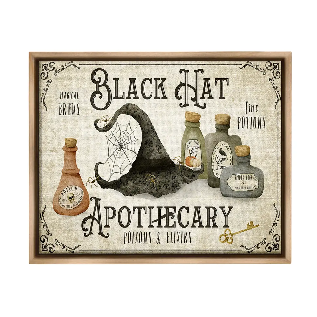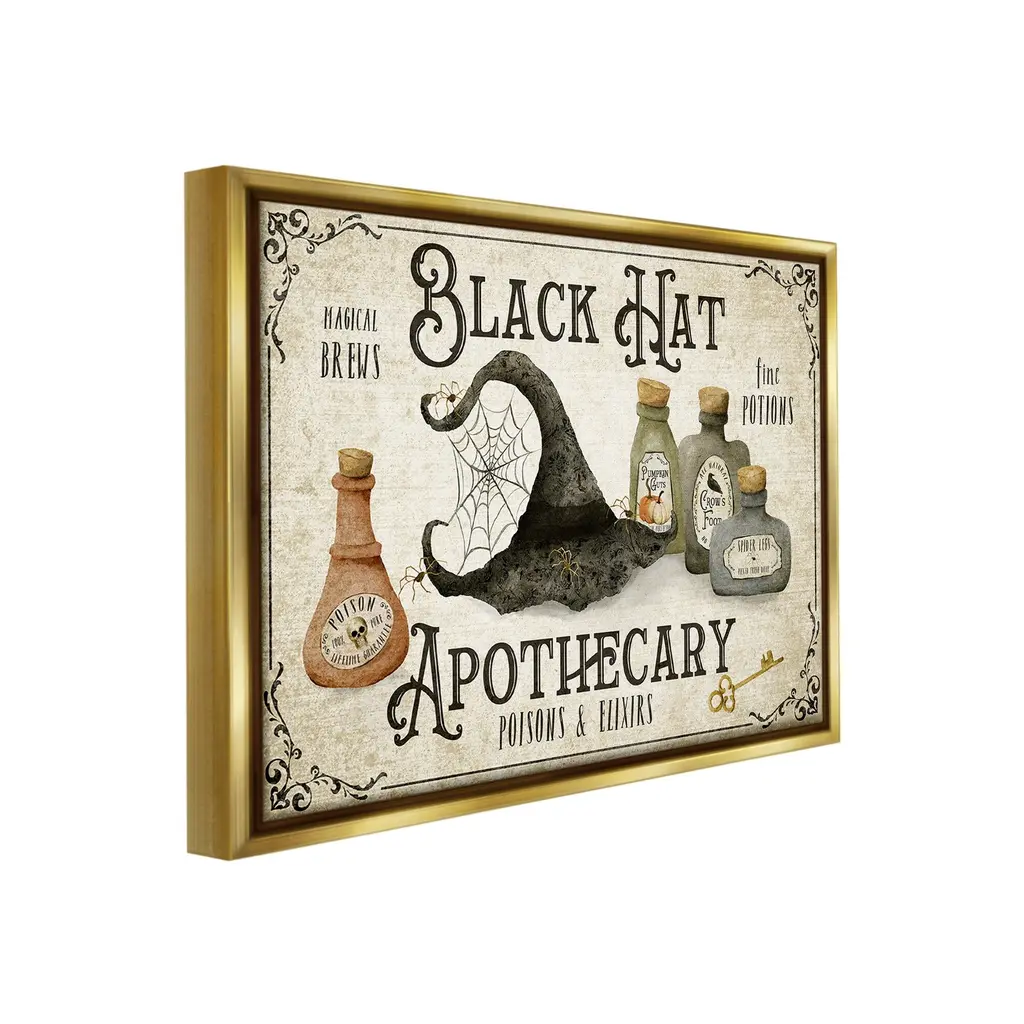 Elevate your home or office to the next level with Stupell Framed Floating Canvas Wall Art. Our premium hand-stretched canvas is mounted securely into a sturdy lightweight frame. The museum-style gap between the wrapped canvas and the box frame gives the illusion of floating artwork. Stupell Wall Art is made in the USA.Features: Dimensions: 21 x 1.7 x 17 Frame, 20 x 1.5 x 16 Canvas ArtFloating Frame Canvas Products are available in sizes 21"x17" and 31"x25". All Floating Frame Canvas Products have a 1.7" Depth.Wall Art is Ready to Hang with Hardware Free Hanging. No Installation required. For Easy Set Up Lean or Layer Artwork on Shelf or Against Wall. Artwork is Permently Fixed into the Frame.Our elevated 1.7" Thick Floating Frame is the perfect complement to our canvas style Wall Art. We use only the highest quality inks in house with industry leading printing solutions. Canvas is hand stretched over a durable wood foundation and then mounted securly into a Modern Box Frame. Made in the USA.Artwork Relates To: Bottle, Jar, Witch, Herb, Brew, Potion, Spider Web, Spider, Halloween, Vintage, Rustic, Black Hat ApothecaryDesign by Deane Beesley