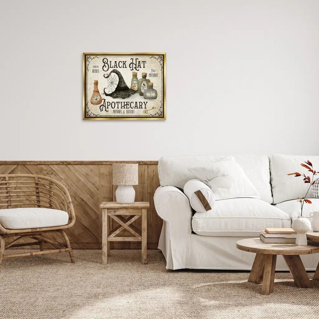 Elevate your home or office to the next level with Stupell Framed Floating Canvas Wall Art. Our premium hand-stretched canvas is mounted securely into a sturdy lightweight frame. The museum-style gap between the wrapped canvas and the box frame gives the illusion of floating artwork. Stupell Wall Art is made in the USA.Features: Dimensions: 21 x 1.7 x 17 Frame, 20 x 1.5 x 16 Canvas ArtFloating Frame Canvas Products are available in sizes 21"x17" and 31"x25". All Floating Frame Canvas Products have a 1.7" Depth.Wall Art is Ready to Hang with Hardware Free Hanging. No Installation required. For Easy Set Up Lean or Layer Artwork on Shelf or Against Wall. Artwork is Permently Fixed into the Frame.Our elevated 1.7" Thick Floating Frame is the perfect complement to our canvas style Wall Art. We use only the highest quality inks in house with industry leading printing solutions. Canvas is hand stretched over a durable wood foundation and then mounted securly into a Modern Box Frame. Made in the USA.Artwork Relates To: Bottle, Jar, Witch, Herb, Brew, Potion, Spider Web, Spider, Halloween, Vintage, Rustic, Black Hat ApothecaryDesign by Deane Beesley