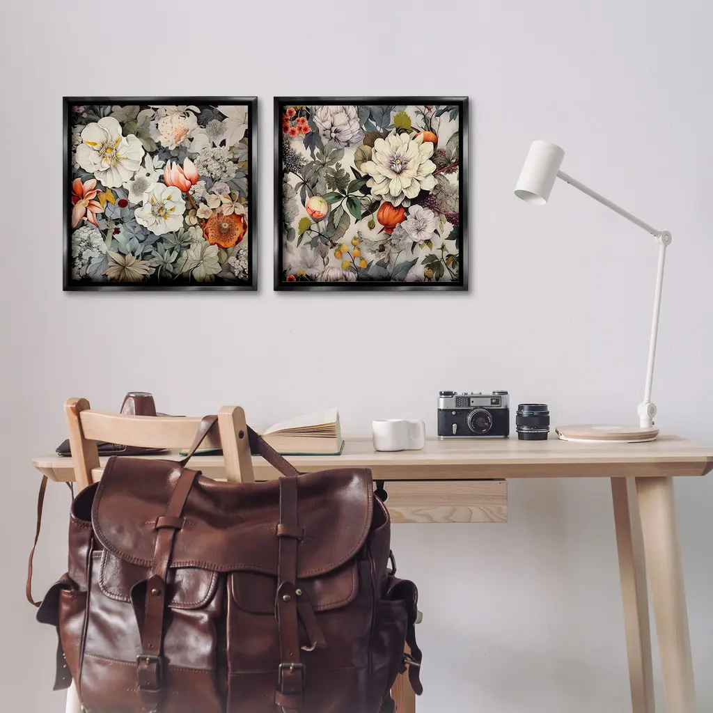 Elevate your home or office to the next level with Stupell Framed Floating Canvas Wall Art. Our premium hand-stretched canvas is mounted securely into a sturdy lightweight frame. The museum-style gap between the wrapped canvas and the box frame gives the illusion of floating artwork. Stupell Wall Art is made in the USA.Features: Dimensions: 2 Piece Set, Each Frame is 18 x 1.7 x 18Two Piece Floating Frame Canvas Products are available as 18"x18" or 25"x25" Panels. All Floating Frame Canvas Products have a 1.7" Depth.Wall Art is Ready to Hang with Hardware Free Hanging. No Installation required. For Easy Set Up Lean or Layer Artwork on Shelf or Against Wall. Artwork is Permently Fixed into the Frame.Our elevated 1.7" Thick Floating Frame is the perfect complement to our canvas style Wall Art. We use only the highest quality inks in house with industry leading printing solutions. Canvas is hand stretched over a durable wood foundation and then mounted securly into a Modern Box Frame. Made in the USA.Artwork Relates To: Floral, Pattern, Flower, Petal, Plant, Vintage, Botanical, BouquetDesign by Lazar Studio