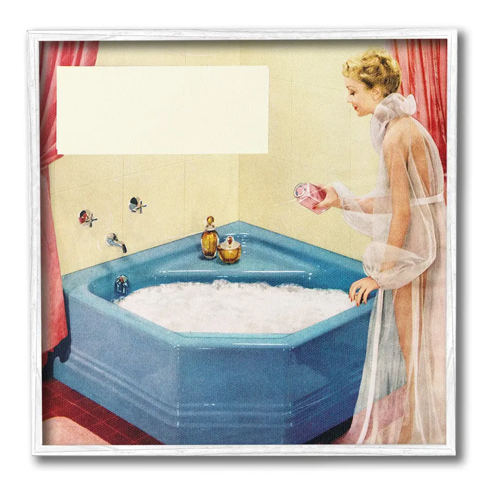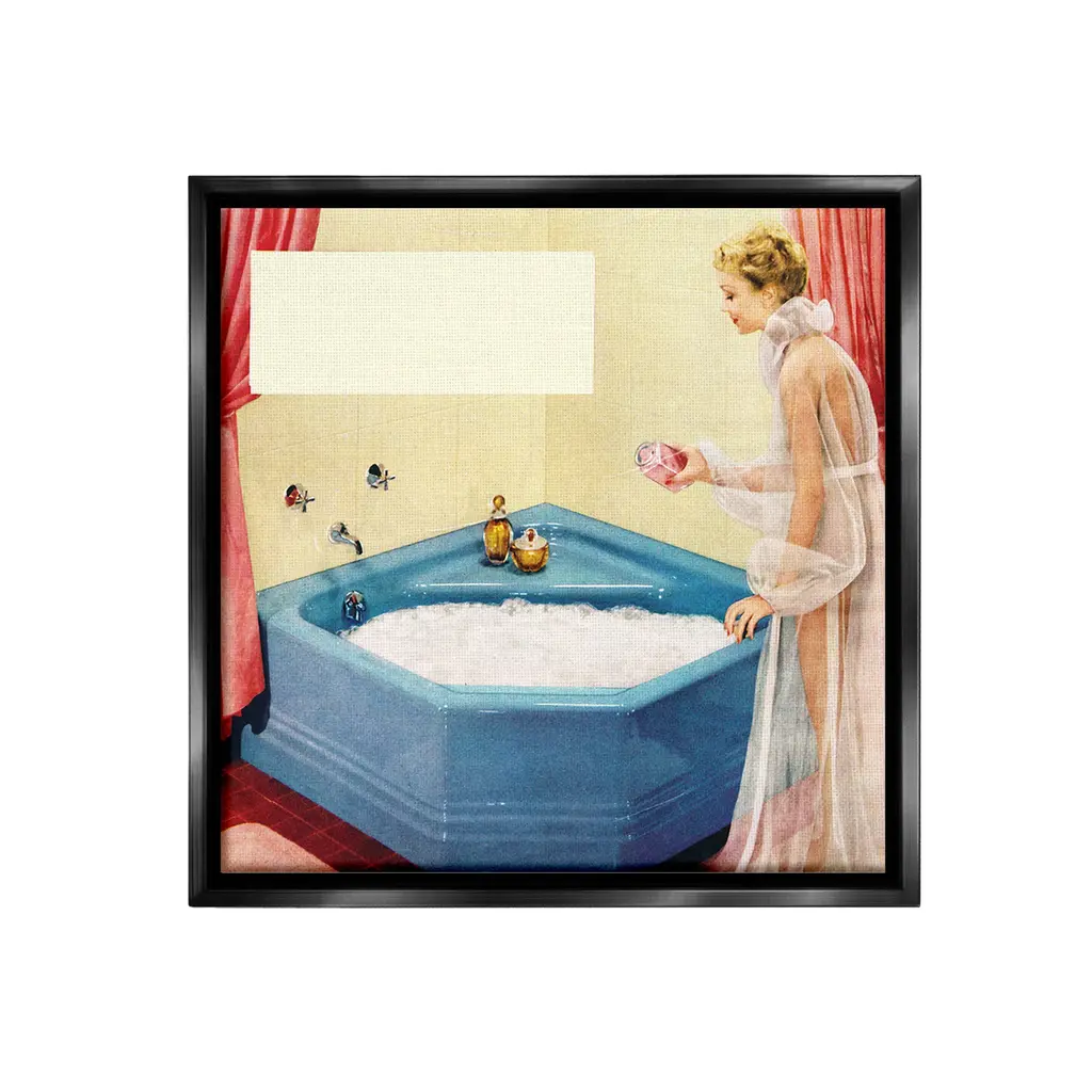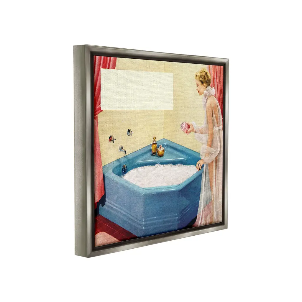 Elevate your home or office to the next level with Stupell Framed Floating Canvas Wall Art. Our premium hand-stretched canvas is mounted securely into a sturdy lightweight frame. The museum-style gap between the wrapped canvas and the box frame gives the illusion of floating artwork. Stupell Wall Art is made in the USA.Features: Dimensions: 18 x 1.7 x 18 Frame, 17 x 1.5 x 17 Canvas ArtFloating Frame Canvas Products are available in sizes 18"x18" and 25"x25". All Floating Frame Canvas Products have a 1.7" Depth.Wall Art is Ready to Hang with Hardware Free Hanging. No Installation required. For Easy Set Up Lean or Layer Artwork on Shelf or Against Wall. Artwork is Permently Fixed into the Frame.Our elevated 1.7" Thick Floating Frame is the perfect complement to our canvas style Wall Art. We use only the highest quality inks in house with industry leading printing solutions. Canvas is hand stretched over a durable wood foundation and then mounted securly into a Modern Box Frame. Made in the USA.Artwork Relates To: Tub, Bathing, Bathtub, Person, Woman, Female, Girl, Bathroom, Bubble Bath, VintageDesign by Kathy Alper