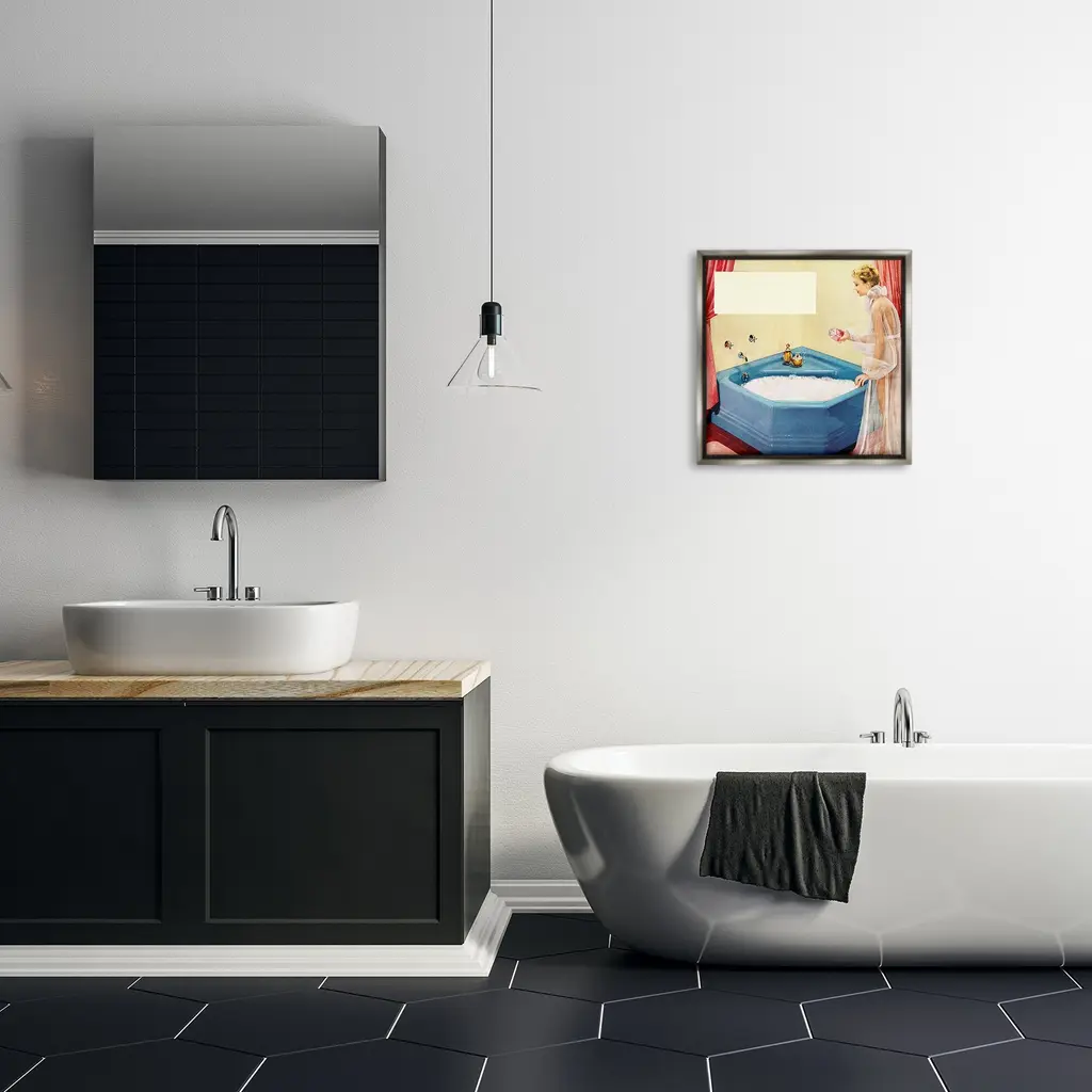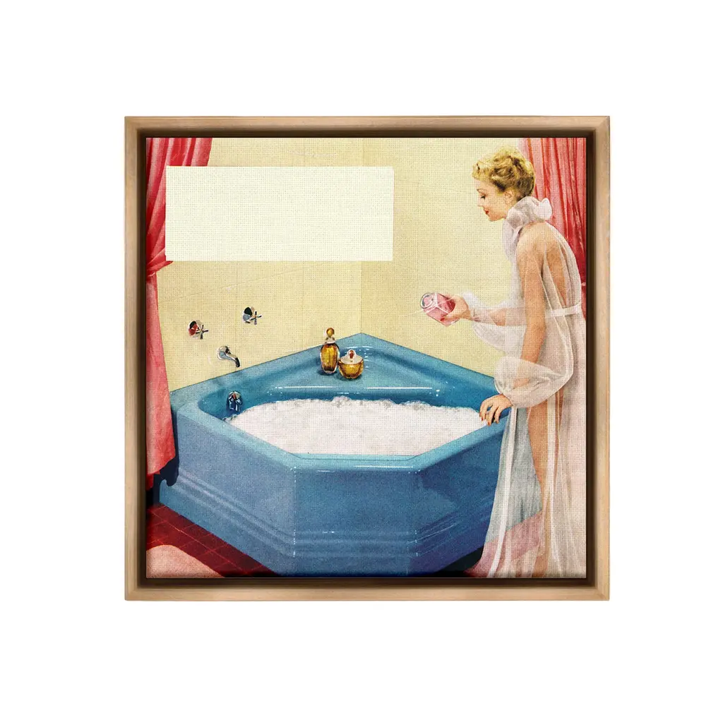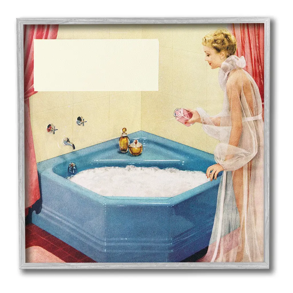 Elevate your home or office to the next level with Stupell Framed Floating Canvas Wall Art. Our premium hand-stretched canvas is mounted securely into a sturdy lightweight frame. The museum-style gap between the wrapped canvas and the box frame gives the illusion of floating artwork. Stupell Wall Art is made in the USA.Features: Dimensions: 18 x 1.7 x 18 Frame, 17 x 1.5 x 17 Canvas ArtFloating Frame Canvas Products are available in sizes 18"x18" and 25"x25". All Floating Frame Canvas Products have a 1.7" Depth.Wall Art is Ready to Hang with Hardware Free Hanging. No Installation required. For Easy Set Up Lean or Layer Artwork on Shelf or Against Wall. Artwork is Permently Fixed into the Frame.Our elevated 1.7" Thick Floating Frame is the perfect complement to our canvas style Wall Art. We use only the highest quality inks in house with industry leading printing solutions. Canvas is hand stretched over a durable wood foundation and then mounted securly into a Modern Box Frame. Made in the USA.Artwork Relates To: Tub, Bathing, Bathtub, Person, Woman, Female, Girl, Bathroom, Bubble Bath, VintageDesign by Kathy Alper