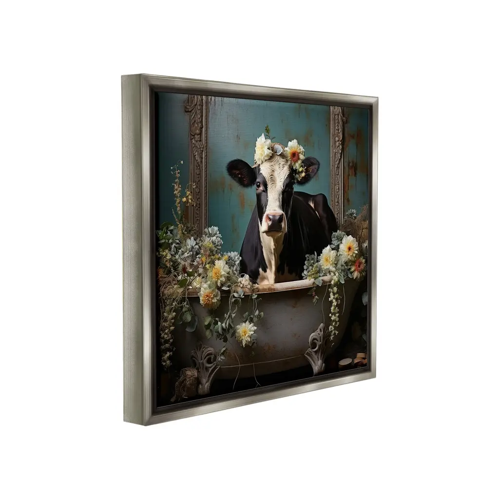 Elevate your home or office to the next level with Stupell Framed Floating Canvas Wall Art. Our premium hand-stretched canvas is mounted securely into a sturdy lightweight frame. The museum-style gap between the wrapped canvas and the box frame gives the illusion of floating artwork. Stupell Wall Art is made in the USA.Features: Dimensions: 18 x 1.7 x 18 Frame, 17 x 1.5 x 17 Canvas ArtFloating Frame Canvas Products are available in sizes 18"x18" and 25"x25". All Floating Frame Canvas Products have a 1.7" Depth.Wall Art is Ready to Hang with Hardware Free Hanging. No Installation required. For Easy Set Up Lean or Layer Artwork on Shelf or Against Wall. Artwork is Permently Fixed into the Frame.Our elevated 1.7" Thick Floating Frame is the perfect complement to our canvas style Wall Art. We use only the highest quality inks in house with industry leading printing solutions. Canvas is hand stretched over a durable wood foundation and then mounted securly into a Modern Box Frame. Made in the USA.Artwork Relates To: Bathroom, Animal, Tub, Flower, Blossom, Cow, Cattle, VintageDesign by Lazar Studio