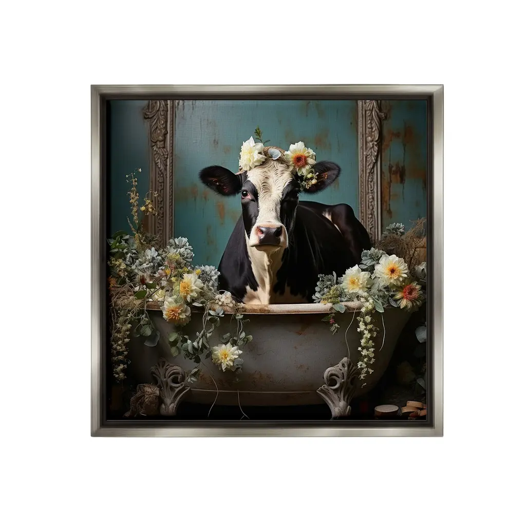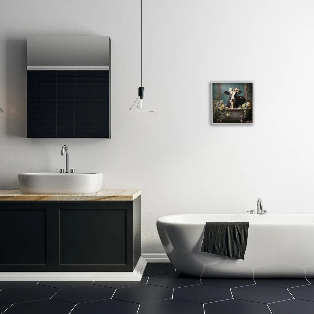 Add dimension to any room with our textured Framed Giclee Artwork. Our framed artwork is securely mounted into a 1.5-inch thick wood grain frame and ready to hang. Frames are available in three alluring styles: black, gray farmhouse and white. In addition, you should check out our oversized options if you want a statement piece. Stupell Wall Art is made in the USA.Features: Dimensions: 12 x 1.5 x 12 FramedFramed Giclee Product Sizes Include 12"x12", 17"x17", and 24"x24". Framed Giclee Products have a 1.5" Depth. Wall Art is Ready to Hang with Hardware Free Hanging. No installation required. For Easy Set Up Lean or Layer Artwork on Shelf or Against Wall.Our giclée prints are carefully mounted on a durable MDF backing, and then perfectly finished in a 1.5 inch thick woodgrain frame. Mounted frame colors include black, gray farmhouse and white. Made In USA.Artwork Relates To: Bathroom, Animal, Tub, Flower, Blossom, Cow, Cattle, VintageDesign by Lazar Studio