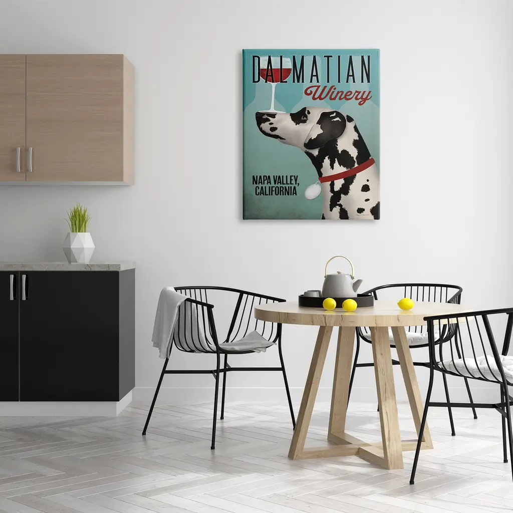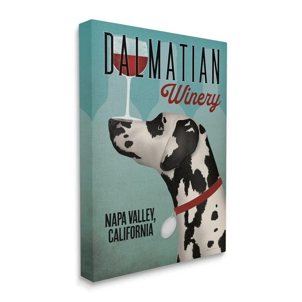 We create our stretched canvas to the highest standards. Using only the highest quality inks and canvas on Mimaki printers, we hand-cut and stretch each piece over a 1.5-inch thick wooden frame for hanging. As a result, the art comes ready to hang on the sturdy ledge with no installation required. Stupell Wall Art is made in the USA.Features: Dimensions: 16 x 1.5 x 20 InchesStretched Canvas Sizes Include Standard: 16 x 1.5 x 20 Large: 20 x 1.5 x 30 X-Large: 30 x 1.5 x 40 Oversized: 36 x 1.5 x 48Wall Art is Ready to Hang with Hardware Free Hanging. No installation required. For Easy Set Up Lean or Layer Artwork on Shelf or Against Wall.Our stretched canvas is created with the highest standards. We use only the highest quality inks and canvas on our in house Mimaki printers, and then hand cut and stretch each piece over a 1.5 inch thick wooden frame for hanging. Made In USA.Artwork Relates To: Dog, Animal, Mammal, Pet, Coffee, Dalmatian WineryDesign by Ryan Fowler