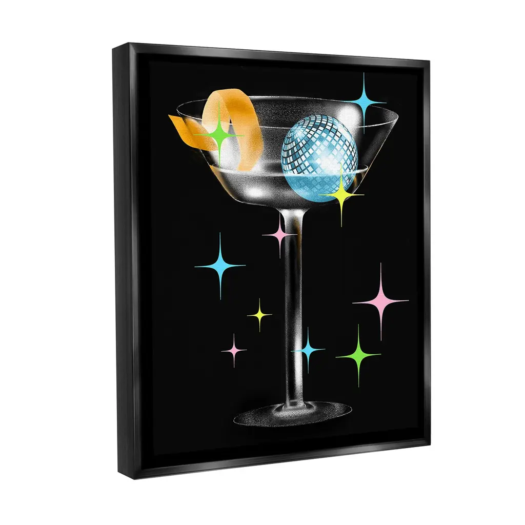 Elevate your home or office to the next level with Stupell Framed Floating Canvas Wall Art. Our premium hand-stretched canvas is mounted securely into a sturdy lightweight frame. The museum-style gap between the wrapped canvas and the box frame gives the illusion of floating artwork. Stupell Wall Art is made in the USA.Features: Dimensions: 17 x 1.7 x 21 Frame, 16 x 1.5 x 20 Canvas ArtFloating Frame Canvas Products are available in sizes 17"x21" and 25"x31". All Floating Frame Canvas Products have a 1.7" Depth.Wall Art is Ready to Hang with Hardware Free Hanging. No Installation required. For Easy Set Up Lean or Layer Artwork on Shelf or Against Wall. Artwork is Permently Fixed into the Frame.Our elevated 1.7" Thick Floating Frame is the perfect complement to our canvas style Wall Art. We use only the highest quality inks in house with industry leading printing solutions. Canvas is hand stretched over a durable wood foundation and then mounted securly into a Modern Box Frame. Made in the USA.Artwork Relates To: Dance, Music, Disco, Pattern, Abstract, Shape, Modern, Glam, Person, Hand, Cocktail, MartiniDesign by Lil' Rue