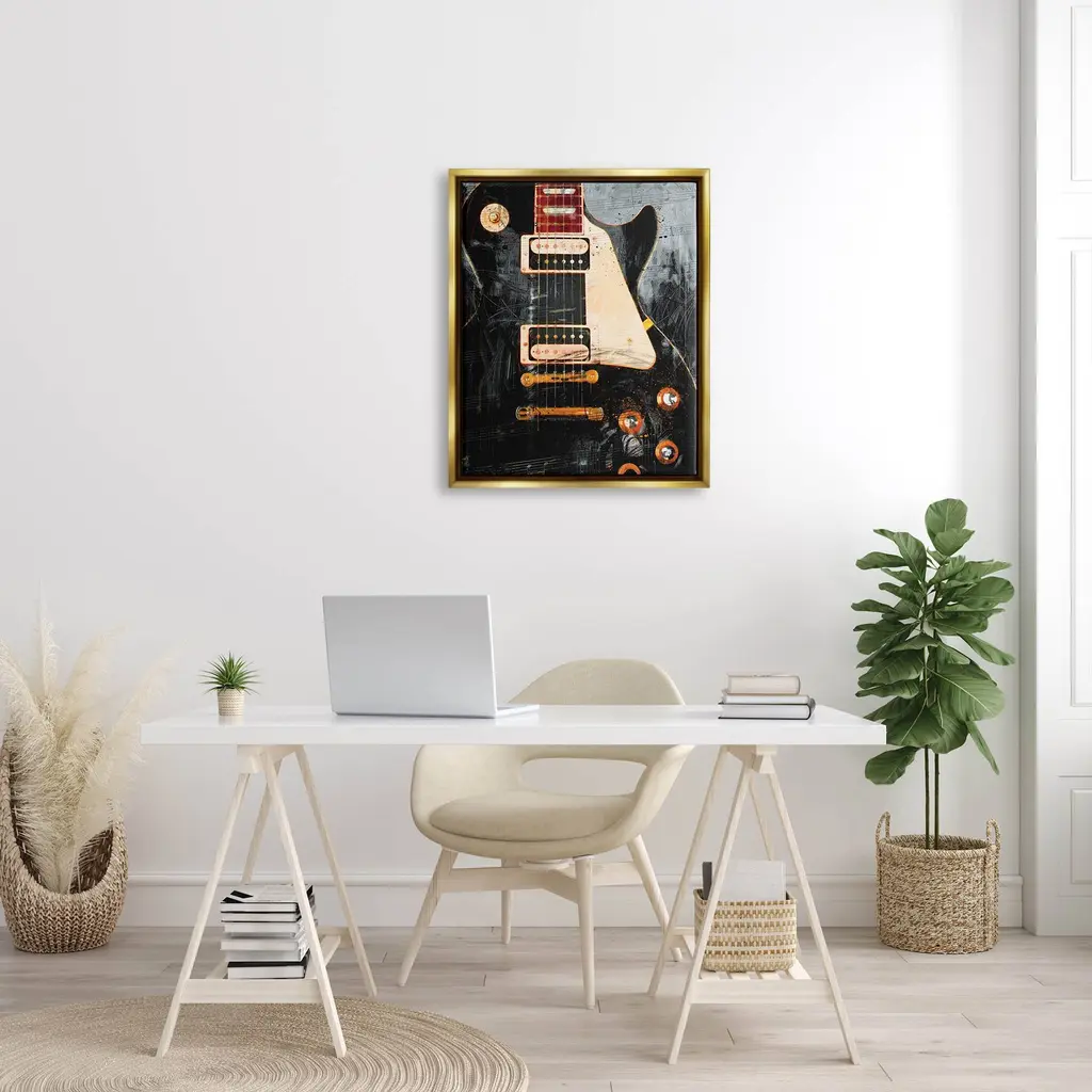 Elevate your home or office to the next level with Stupell Framed Floating Canvas Wall Art. Our premium hand stretched canvas is mounted securly into a sturdy lightweight frame. The museum style gap between wrapped canvas and box frame gives the illusion of floating artwork. Features: Dimensions: 17 x 1.7 x 21 Frame, 16 x 1.5 x 20 Canvas ArtFloating Frame Sizes Include Standard: 17 x 1.7 x 21 Oversized: 25 x 1.7 x 31Wall Art is Ready to Hang - No Installation or Hardware Needed. For Easy Set Up Lean or Layer Artwork on Shelf or Against Wall.Our elevated 1.7" Thick Floating Frame is the perfect complement to our canvas style Wall Art. We use only the highest quality inks in house with industry leading printing solutions. Canvas is hand stretched over a durable wood foundation and then mounted securly into a Modern Box Frame. Made in the USA.Artwork Relates To: Guitar, Musical Instrument, Electric Guitar, Music, Vintage, Sheet Music, Music NotesDesign by Savannah Miller