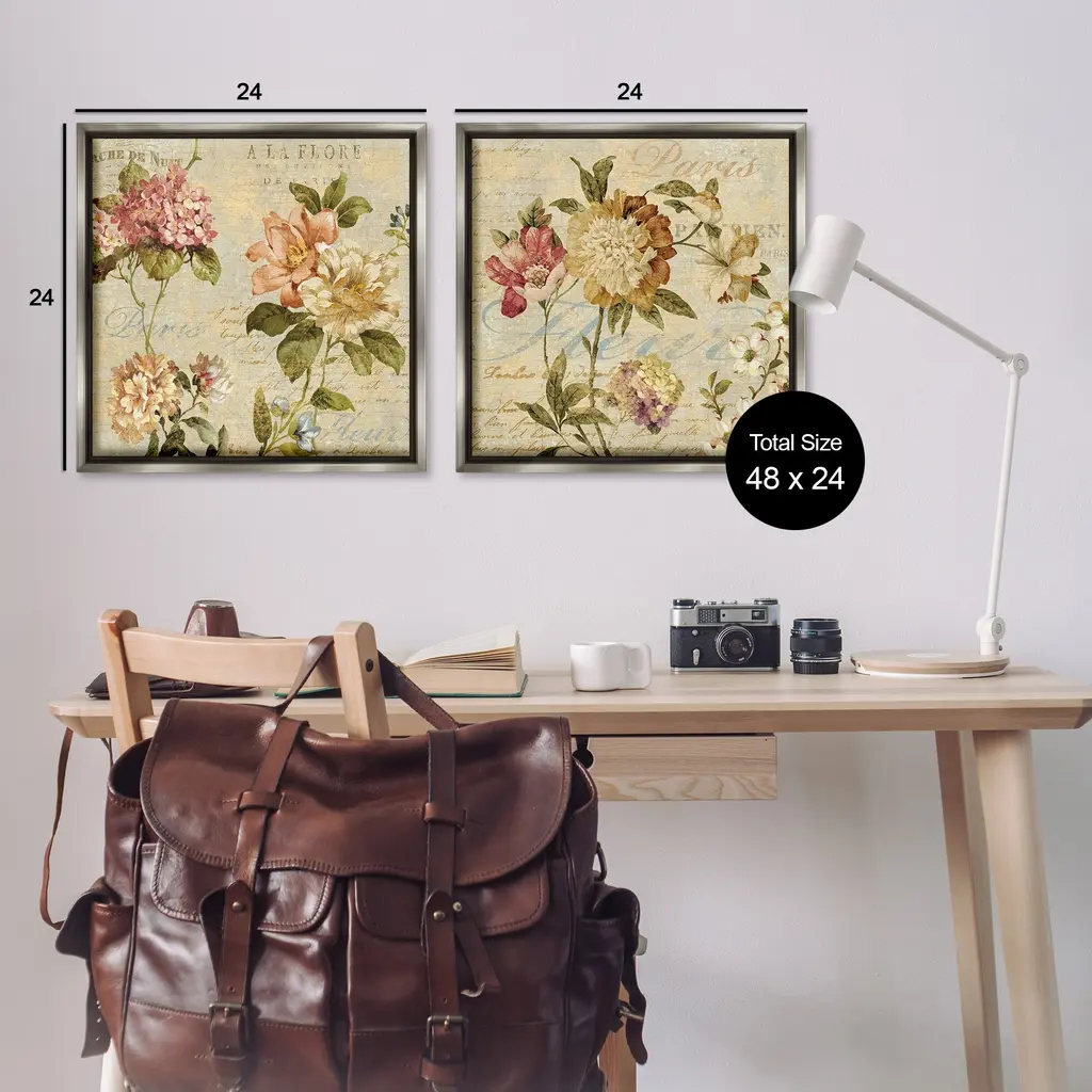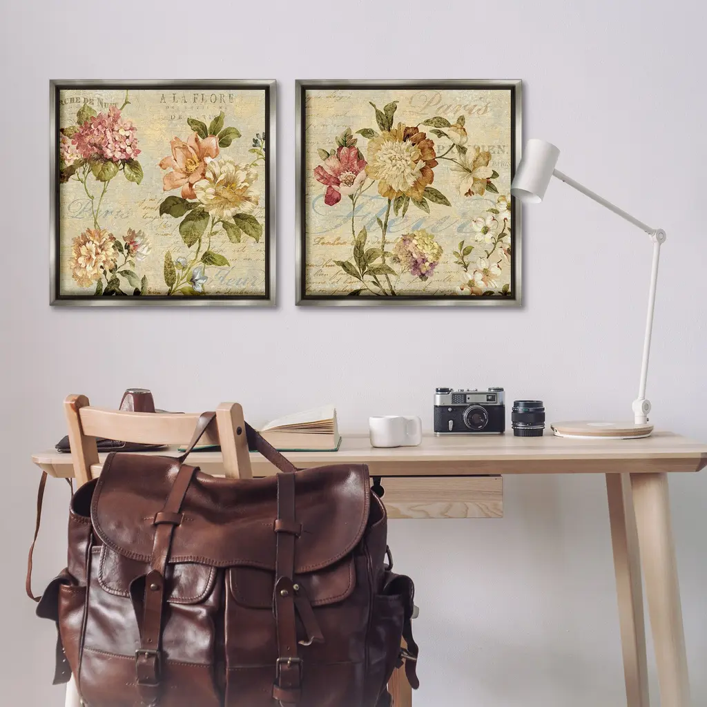 Elevate your home or office to the next level with Stupell Framed Floating Canvas Wall Art. Our premium hand-stretched canvas is mounted securely into a sturdy lightweight frame. The museum-style gap between the wrapped canvas and the box frame gives the illusion of floating artwork. Stupell Wall Art is made in the USA.Features: Dimensions: 2 Piece Set, Each Frame is 18 x 1.7 x 18Two Piece Floating Frame Canvas Products are available as 18"x18" or 25"x25" Panels. All Floating Frame Canvas Products have a 1.7" Depth.Wall Art is Ready to Hang with Hardware Free Hanging. No Installation required. For Easy Set Up Lean or Layer Artwork on Shelf or Against Wall. Artwork is Permently Fixed into the Frame.Our elevated 1.7" Thick Floating Frame is the perfect complement to our canvas style Wall Art. We use only the highest quality inks in house with industry leading printing solutions. Canvas is hand stretched over a durable wood foundation and then mounted securly into a Modern Box Frame. Made in the USA.Artwork Relates To: Vintage, Flower, Floral, Pattern, French, CursiveDesign by Deborah Devellier