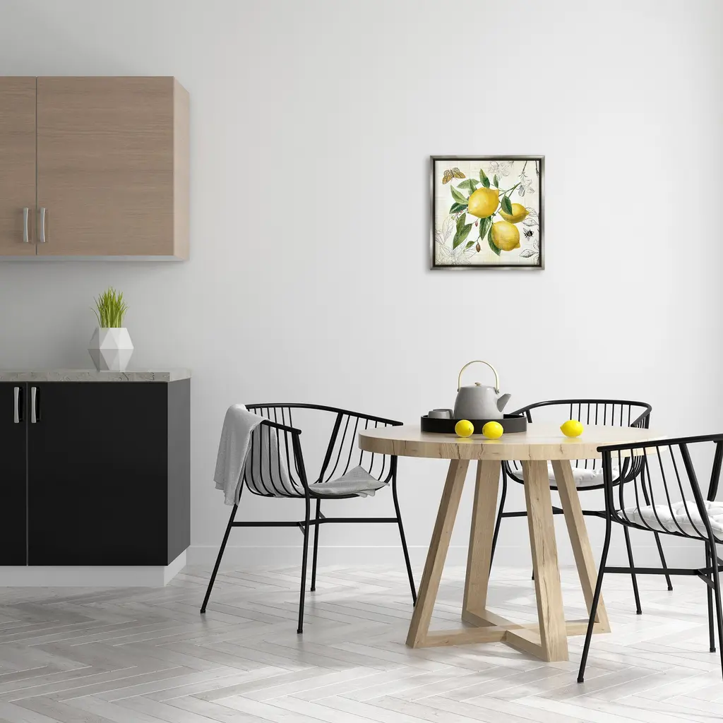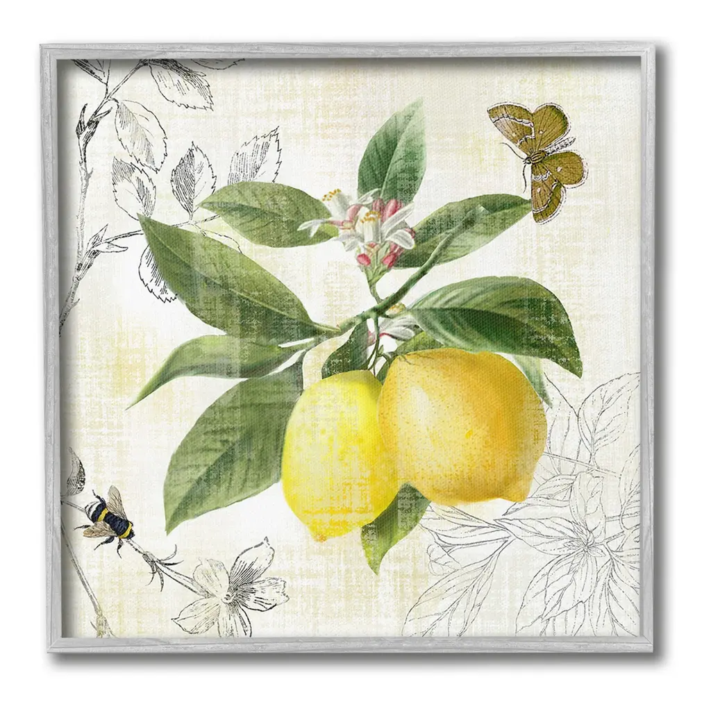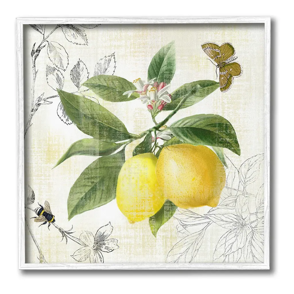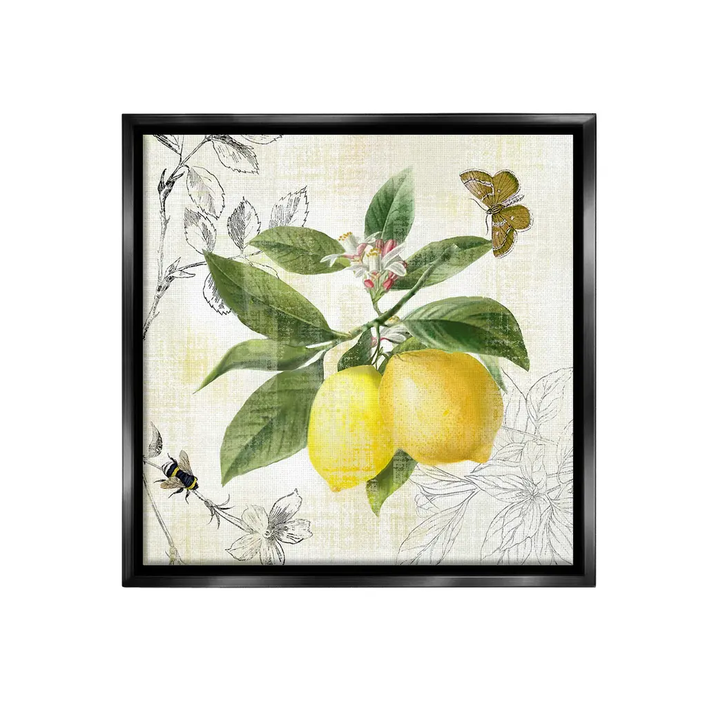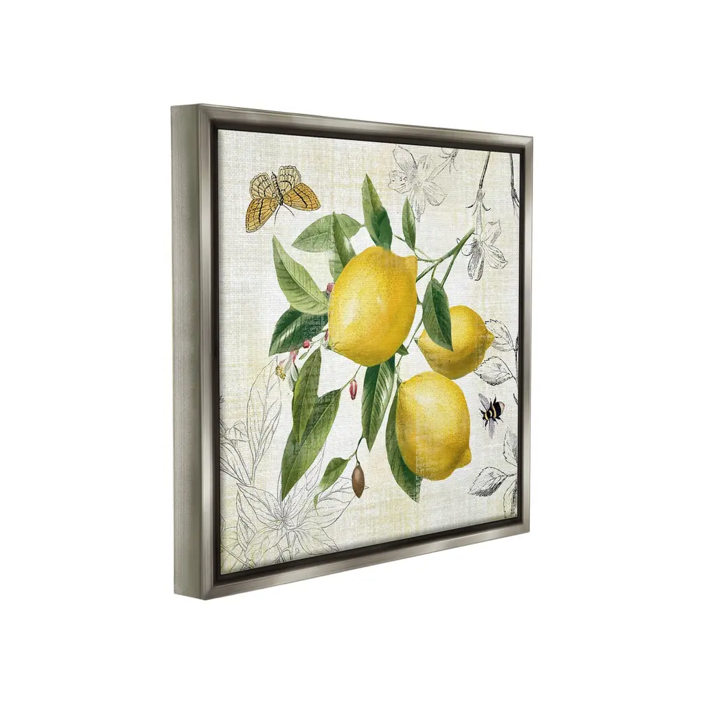 Elevate your home or office to the next level with Stupell Framed Floating Canvas Wall Art. Our premium hand-stretched canvas is mounted securely into a sturdy lightweight frame. The museum-style gap between the wrapped canvas and the box frame gives the illusion of floating artwork. Stupell Wall Art is made in the USA.Features: Dimensions: 18 x 1.7 x 18 Frame, 17 x 1.5 x 17 Canvas ArtFloating Frame Canvas Products are available in sizes 18"x18" and 25"x25". All Floating Frame Canvas Products have a 1.7" Depth.Wall Art is Ready to Hang with Hardware Free Hanging. No Installation required. For Easy Set Up Lean or Layer Artwork on Shelf or Against Wall. Artwork is Permently Fixed into the Frame.Our elevated 1.7" Thick Floating Frame is the perfect complement to our canvas style Wall Art. We use only the highest quality inks in house with industry leading printing solutions. Canvas is hand stretched over a durable wood foundation and then mounted securly into a Modern Box Frame. Made in the USA.Artwork Relates To: Citrus, Food, Fruit, Lemon, Plant, Produce, Animal, Bee, Insect, Butterfly, Pattern, Floral, Country, KitchenDesign by Nan