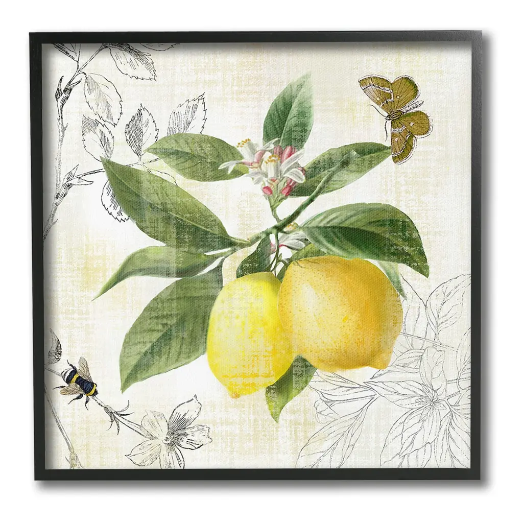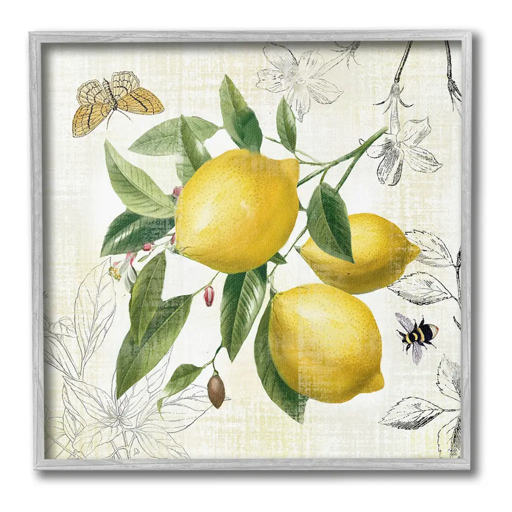 Add dimension to any room with our textured Framed Giclee Artwork. Our framed artwork is securely mounted into a 1.5-inch thick wood grain frame and ready to hang. Frames are available in three alluring styles: black, gray farmhouse and white. In addition, you should check out our oversized options if you want a statement piece. Stupell Wall Art is made in the USA.Features: Dimensions: 12 x 1.5 x 12 FramedFramed Giclee Product Sizes Include 12"x12", 17"x17", and 24"x24". Framed Giclee Products have a 1.5" Depth. Wall Art is Ready to Hang with Hardware Free Hanging. No installation required. For Easy Set Up Lean or Layer Artwork on Shelf or Against Wall.Our giclée prints are carefully mounted on a durable MDF backing, and then perfectly finished in a 1.5 inch thick woodgrain frame. Mounted frame colors include black, gray farmhouse and white. Made In USA.Artwork Relates To: Citrus, Food, Fruit, Lemon, Plant, Produce, Animal, Bee, Insect, Butterfly, Pattern, Floral, Country, KitchenDesign by Nan