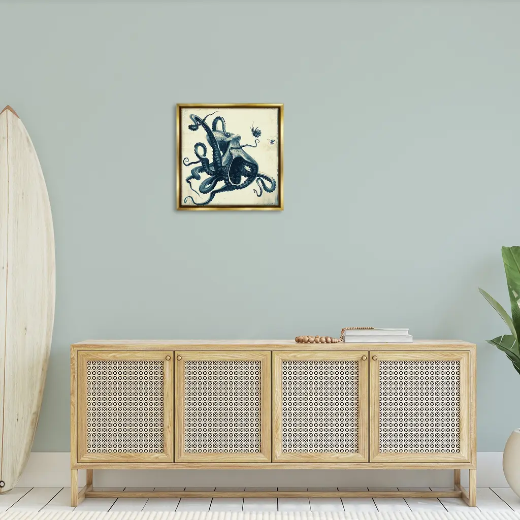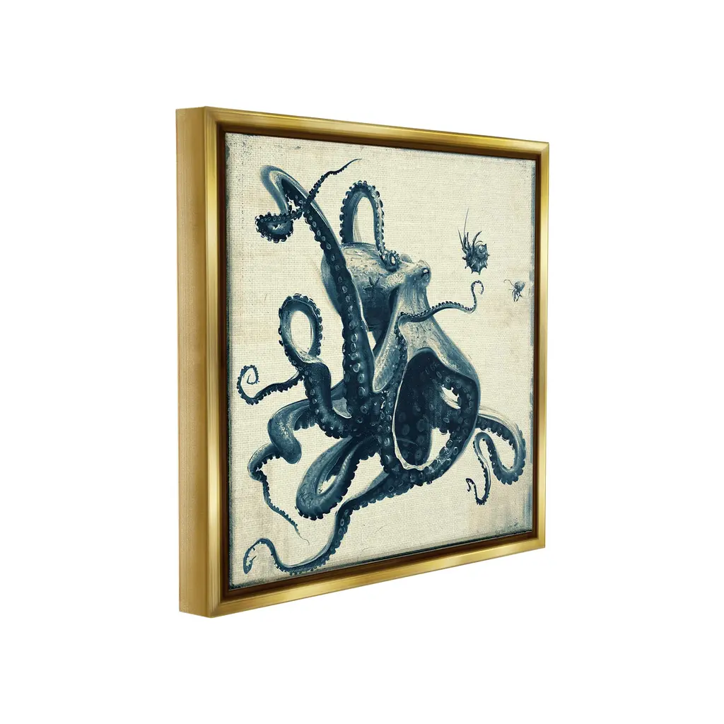 Elevate your home or office to the next level with Stupell Framed Floating Canvas Wall Art. Our premium hand-stretched canvas is mounted securely into a sturdy lightweight frame. The museum-style gap between the wrapped canvas and the box frame gives the illusion of floating artwork. Stupell Wall Art is made in the USA.Features: Dimensions: 18 x 1.7 x 18 Frame, 17 x 1.5 x 17 Canvas ArtFloating Frame Canvas Products are available in sizes 18"x18" and 25"x25". All Floating Frame Canvas Products have a 1.7" Depth.Wall Art is Ready to Hang with Hardware Free Hanging. No Installation required. For Easy Set Up Lean or Layer Artwork on Shelf or Against Wall. Artwork is Permently Fixed into the Frame.Our elevated 1.7" Thick Floating Frame is the perfect complement to our canvas style Wall Art. We use only the highest quality inks in house with industry leading printing solutions. Canvas is hand stretched over a durable wood foundation and then mounted securly into a Modern Box Frame. Made in the USA.Artwork Relates To: Animal, Sea Life, Invertebrate, Octopus, Marine, Ocean, Nautical, BeachDesign by Vlad Mel