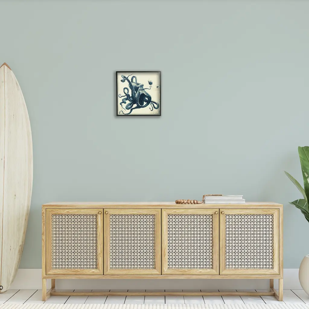 Add dimension to any room with our textured Framed Giclee Artwork. Our framed artwork is securely mounted into a 1.5-inch thick wood grain frame and ready to hang. Frames are available in three alluring styles: black, gray farmhouse and white. In addition, you should check out our oversized options if you want a statement piece. Stupell Wall Art is made in the USA.Features: Dimensions: 12 x 1.5 x 12 FramedFramed Giclee Product Sizes Include 12"x12", 17"x17", and 24"x24". Framed Giclee Products have a 1.5" Depth. Wall Art is Ready to Hang with Hardware Free Hanging. No installation required. For Easy Set Up Lean or Layer Artwork on Shelf or Against Wall.Our giclée prints are carefully mounted on a durable MDF backing, and then perfectly finished in a 1.5 inch thick woodgrain frame. Mounted frame colors include black, gray farmhouse and white. Made In USA.Artwork Relates To: Animal, Sea Life, Invertebrate, Octopus, Marine, Ocean, Nautical, BeachDesign by Vlad Mel