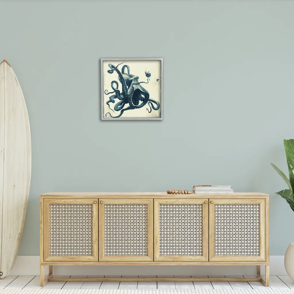 Add dimension to any room with our textured Framed Giclee Artwork. Our framed artwork is securely mounted into a 1.5-inch thick wood grain frame and ready to hang. Frames are available in three alluring styles: black, gray farmhouse and white. In addition, you should check out our oversized options if you want a statement piece. Stupell Wall Art is made in the USA.Features: Dimensions: 12 x 1.5 x 12 FramedFramed Giclee Product Sizes Include 12"x12", 17"x17", and 24"x24". Framed Giclee Products have a 1.5" Depth. Wall Art is Ready to Hang with Hardware Free Hanging. No installation required. For Easy Set Up Lean or Layer Artwork on Shelf or Against Wall.Our giclée prints are carefully mounted on a durable MDF backing, and then perfectly finished in a 1.5 inch thick woodgrain frame. Mounted frame colors include black, gray farmhouse and white. Made In USA.Artwork Relates To: Animal, Sea Life, Invertebrate, Octopus, Marine, Ocean, Nautical, BeachDesign by Vlad Mel