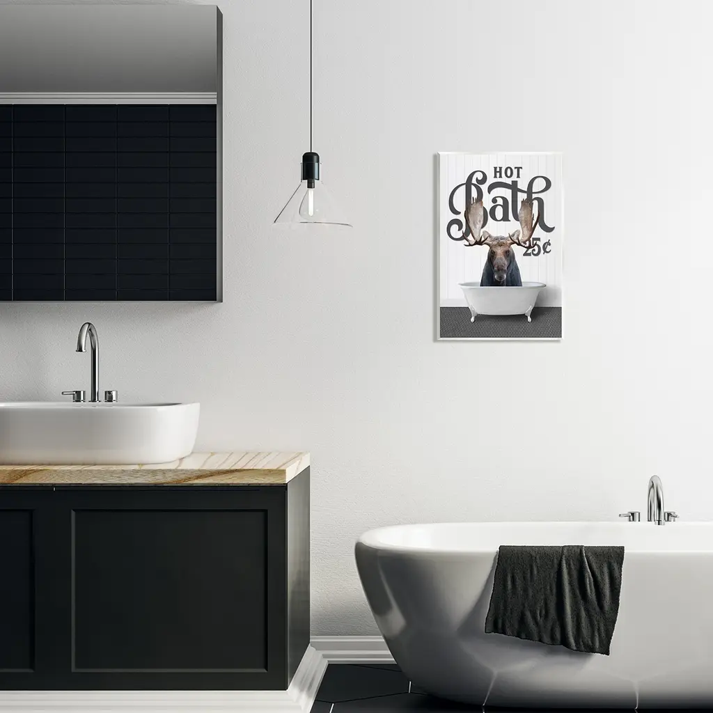 Our wall plaques start as high-quality lithograph prints mounted on durable 0.5-inch thick MDF wood. Each piece is hand finished and comes with a fresh layer of white foil on the sides to give it a crisp, clean look. Plaques arrive ready to hang without installation and come with removable plastic corners to keep them from damage in transit. Stupell Wall Art is made in the USA.Features: Dimensions: 10 x 0.5 x 15 InchesWall Plaque Sizes Include Standard: 10 x 0.5 x 15 Oversized: 13 x 0.5 x 19Wall Art is Ready to Hang with Hardware Free Hanging. No installation required. For Easy Set Up Lean or Layer Artwork on Shelf or Against Wall.All of our wall plaques start off as high quality lithograph prints that are then mounted on durable 0.5 inch thick MDF wood. Each piece is hand finished and comes with a fresh layer of foil on the sides to give it a crisp clean look. Made In USA.Artwork Relates To: Animal, Bathing, Bathroom, Hot Bath, Phrase, MooseDesign by Lettered and Lined