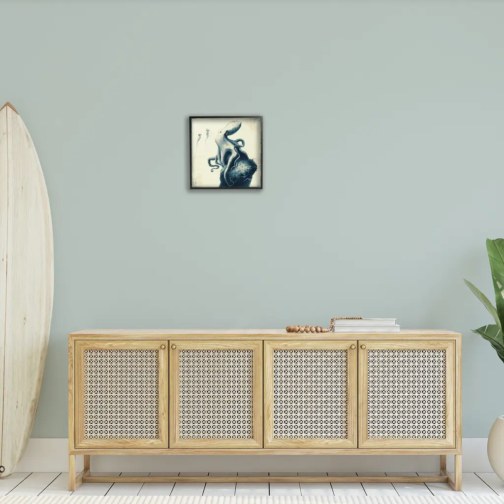 Add dimension to any room with our textured Framed Giclee Artwork. Our framed artwork is securely mounted into a 1.5-inch thick wood grain frame and ready to hang. Frames are available in three alluring styles: black, gray farmhouse and white. In addition, you should check out our oversized options if you want a statement piece. Stupell Wall Art is made in the USA.Features: Dimensions: 12 x 1.5 x 12 FramedFramed Giclee Product Sizes Include 12"x12", 17"x17", and 24"x24". Framed Giclee Products have a 1.5" Depth. Wall Art is Ready to Hang with Hardware Free Hanging. No installation required. For Easy Set Up Lean or Layer Artwork on Shelf or Against Wall.Our giclée prints are carefully mounted on a durable MDF backing, and then perfectly finished in a 1.5 inch thick woodgrain frame. Mounted frame colors include black, gray farmhouse and white. Made In USA.Artwork Relates To: Animal, Sea Life, Invertebrate, Octopus, Marine, Ocean, Nautical, BeachDesign by Vlad Mel