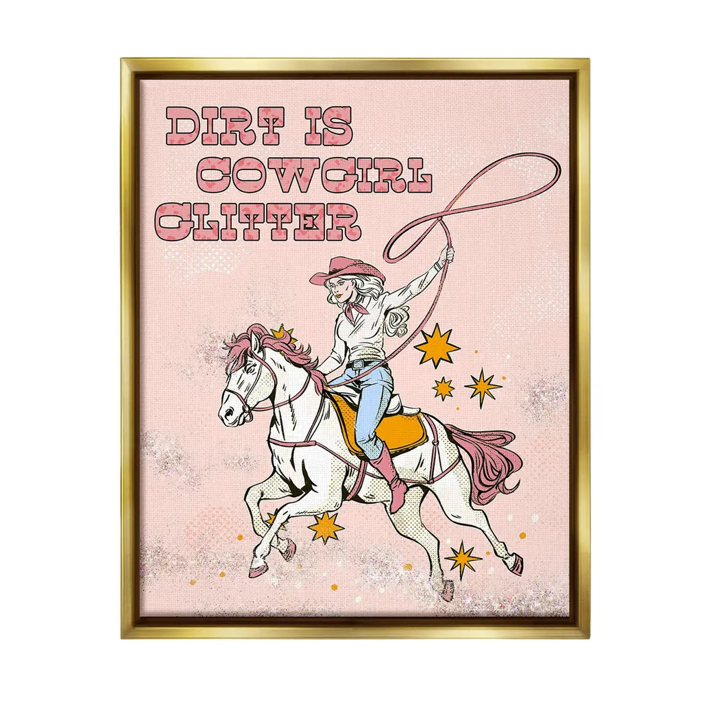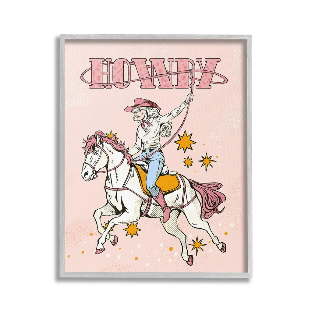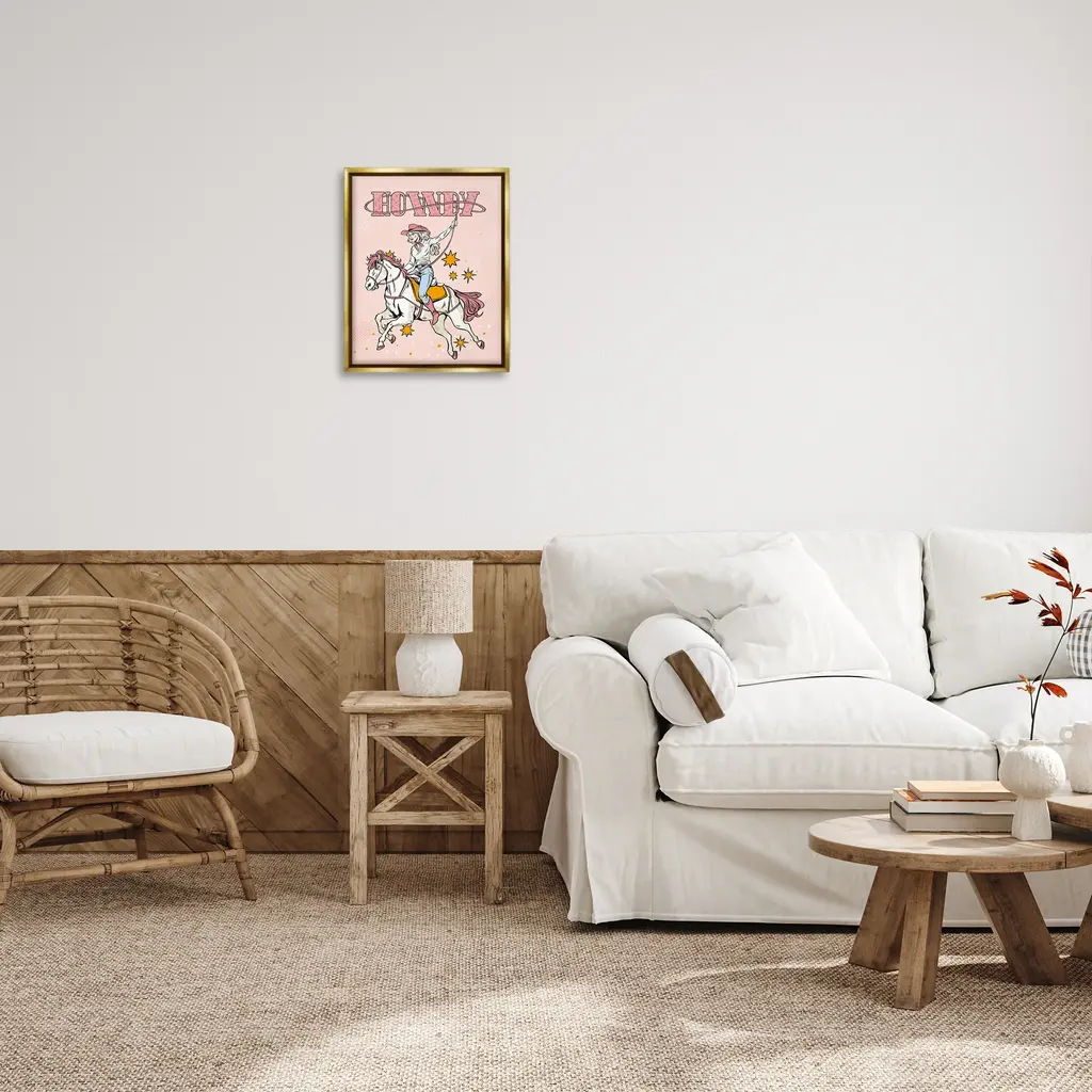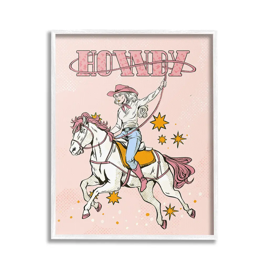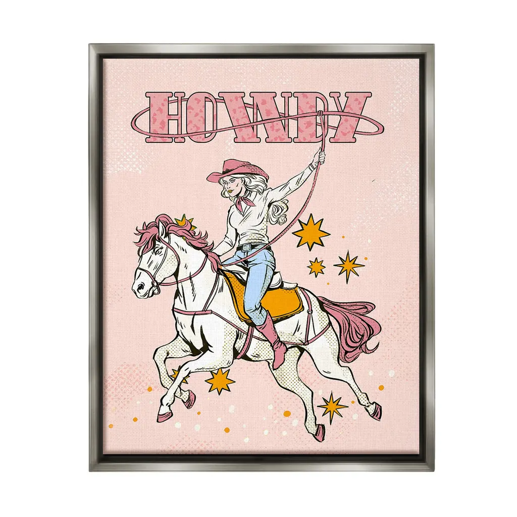 Elevate your home or office to the next level with Stupell Framed Floating Canvas Wall Art. Our premium hand-stretched canvas is mounted securely into a sturdy lightweight frame. The museum-style gap between the wrapped canvas and the box frame gives the illusion of floating artwork. Stupell Wall Art is made in the USA.Features: Dimensions: 17 x 1.7 x 21 Frame, 16 x 1.5 x 20 Canvas ArtFloating Frame Canvas Products are available in sizes 17"x21" and 25"x31". All Floating Frame Canvas Products have a 1.7" Depth.Wall Art is Ready to Hang with Hardware Free Hanging. No Installation required. For Easy Set Up Lean or Layer Artwork on Shelf or Against Wall. Artwork is Permently Fixed into the Frame.Our elevated 1.7" Thick Floating Frame is the perfect complement to our canvas style Wall Art. We use only the highest quality inks in house with industry leading printing solutions. Canvas is hand stretched over a durable wood foundation and then mounted securly into a Modern Box Frame. Made in the USA.Artwork Relates To: Equestrian, Rodeo, Country, Southwestern, Cowgirl, Animal, Horse, Racing, Galloping, Vintage, HowdyDesign by Ziwei Li