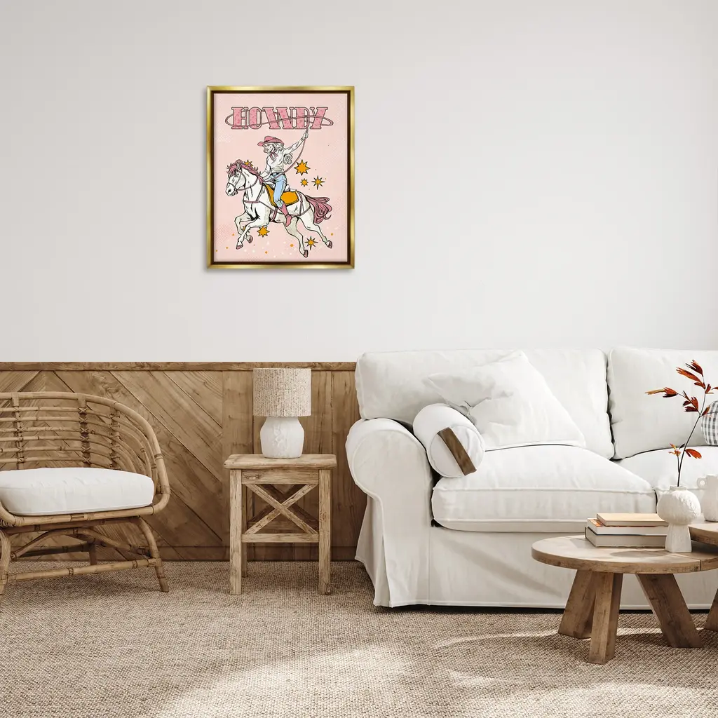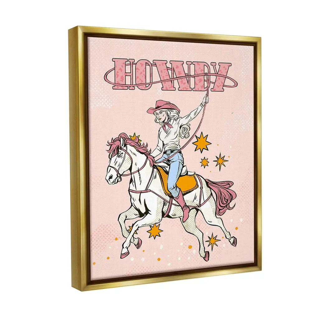 Elevate your home or office to the next level with Stupell Framed Floating Canvas Wall Art. Our premium hand-stretched canvas is mounted securely into a sturdy lightweight frame. The museum-style gap between the wrapped canvas and the box frame gives the illusion of floating artwork. Stupell Wall Art is made in the USA.Features: Dimensions: 17 x 1.7 x 21 Frame, 16 x 1.5 x 20 Canvas ArtFloating Frame Canvas Products are available in sizes 17"x21" and 25"x31". All Floating Frame Canvas Products have a 1.7" Depth.Wall Art is Ready to Hang with Hardware Free Hanging. No Installation required. For Easy Set Up Lean or Layer Artwork on Shelf or Against Wall. Artwork is Permently Fixed into the Frame.Our elevated 1.7" Thick Floating Frame is the perfect complement to our canvas style Wall Art. We use only the highest quality inks in house with industry leading printing solutions. Canvas is hand stretched over a durable wood foundation and then mounted securly into a Modern Box Frame. Made in the USA.Artwork Relates To: Equestrian, Rodeo, Country, Southwestern, Cowgirl, Animal, Horse, Racing, Galloping, Vintage, HowdyDesign by Ziwei Li