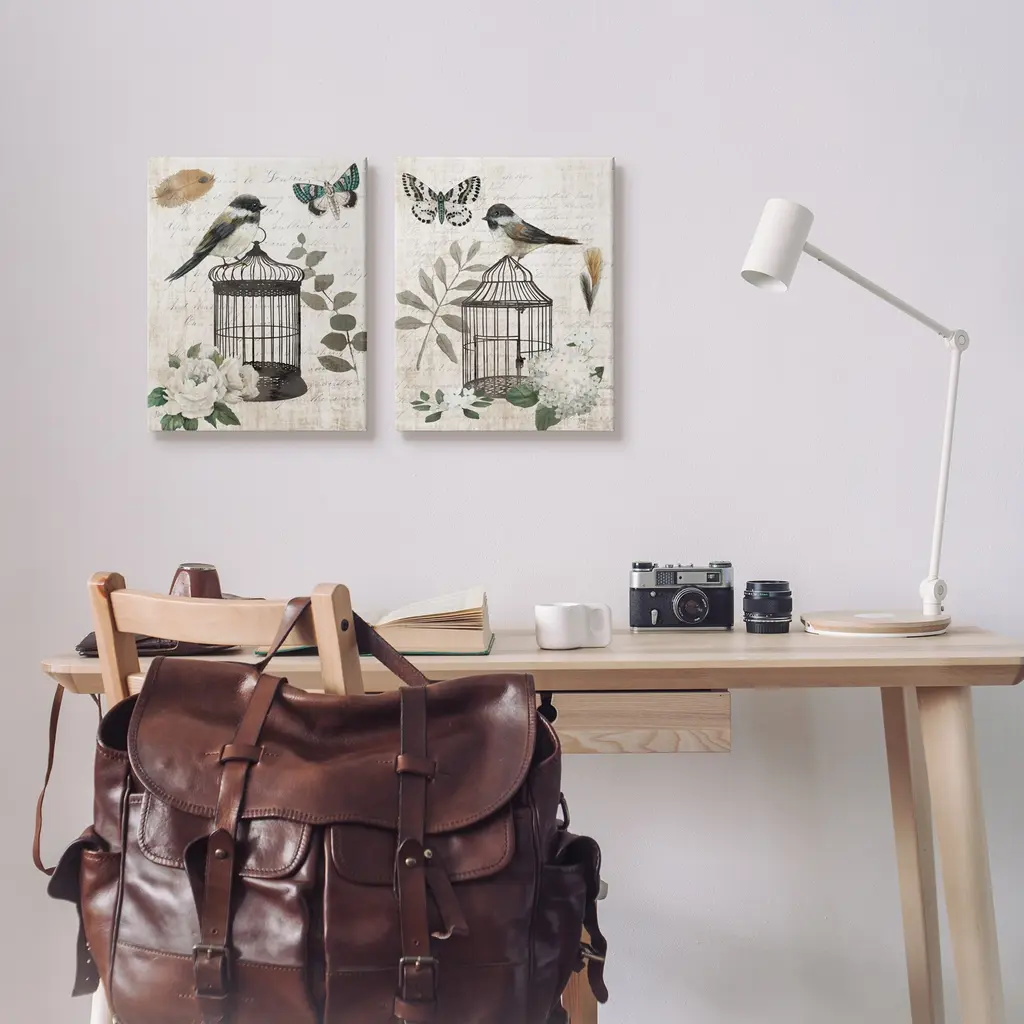 Stupell Vintage Perched Bird Cage Butterfly Timeless Cursive 2 Piece Canvas Wall Art, Design By Nan - 16 X 20