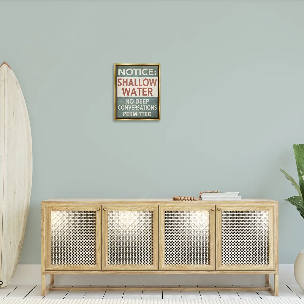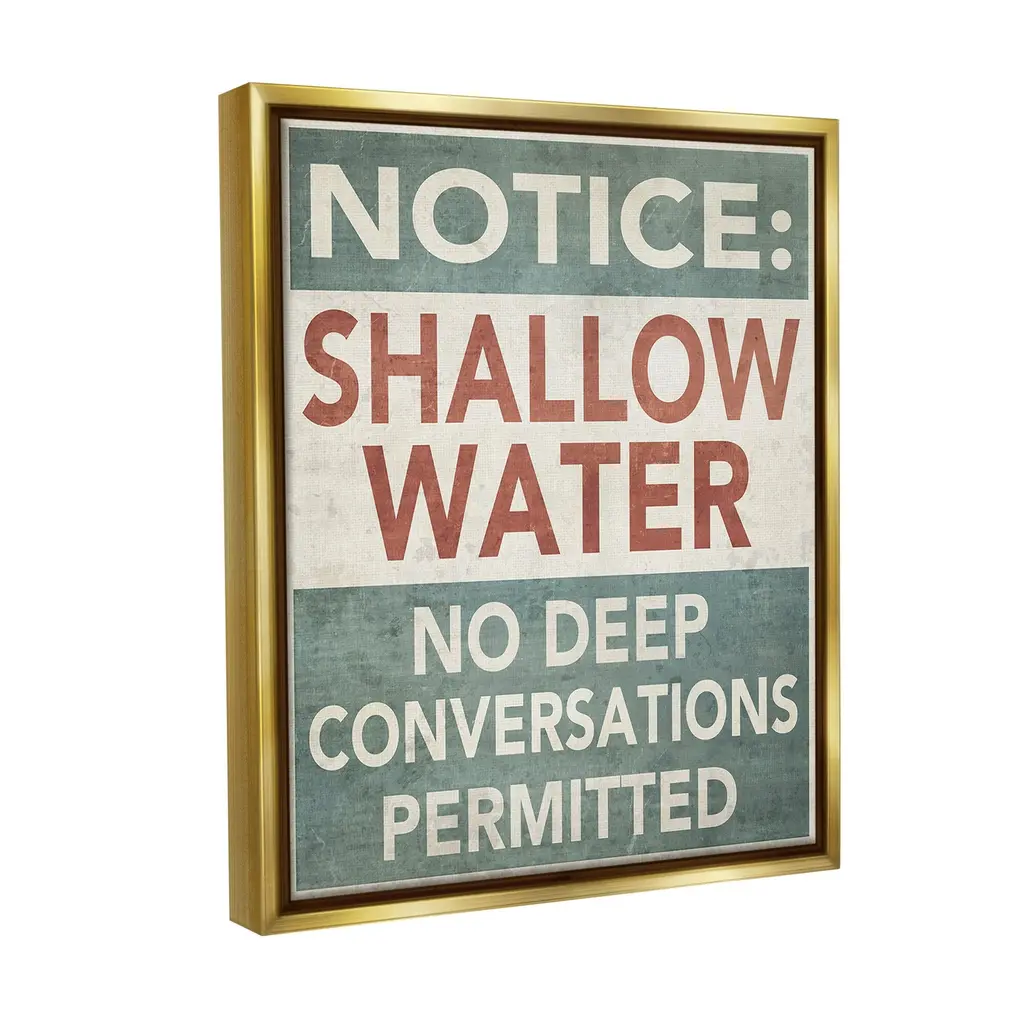 Elevate your home or office to the next level with Stupell Framed Floating Canvas Wall Art. Our premium hand-stretched canvas is mounted securely into a sturdy lightweight frame. The museum-style gap between the wrapped canvas and the box frame gives the illusion of floating artwork. Stupell Wall Art is made in the USA.Features: Dimensions: 17 x 1.7 x 21 Frame, 16 x 1.5 x 20 Canvas ArtFloating Frame Canvas Products are available in sizes 17"x21" and 25"x31". All Floating Frame Canvas Products have a 1.7" Depth.Wall Art is Ready to Hang with Hardware Free Hanging. No Installation required. For Easy Set Up Lean or Layer Artwork on Shelf or Against Wall. Artwork is Permently Fixed into the Frame.Our elevated 1.7" Thick Floating Frame is the perfect complement to our canvas style Wall Art. We use only the highest quality inks in house with industry leading printing solutions. Canvas is hand stretched over a durable wood foundation and then mounted securly into a Modern Box Frame. Made in the USA.Artwork Relates To: Phrase, Humor, Nautical, Beach, Rustic, Vintage, Lake, Notice, Shallow Water No Deep Conversations PermittedDesign by GraffiTee Studios