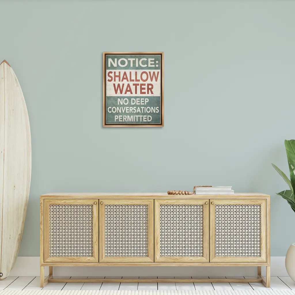 Elevate your home or office to the next level with Stupell Framed Floating Canvas Wall Art. Our premium hand-stretched canvas is mounted securely into a sturdy lightweight frame. The museum-style gap between the wrapped canvas and the box frame gives the illusion of floating artwork. Stupell Wall Art is made in the USA.Features: Dimensions: 17 x 1.7 x 21 Frame, 16 x 1.5 x 20 Canvas ArtFloating Frame Canvas Products are available in sizes 17"x21" and 25"x31". All Floating Frame Canvas Products have a 1.7" Depth.Wall Art is Ready to Hang with Hardware Free Hanging. No Installation required. For Easy Set Up Lean or Layer Artwork on Shelf or Against Wall. Artwork is Permently Fixed into the Frame.Our elevated 1.7" Thick Floating Frame is the perfect complement to our canvas style Wall Art. We use only the highest quality inks in house with industry leading printing solutions. Canvas is hand stretched over a durable wood foundation and then mounted securly into a Modern Box Frame. Made in the USA.Artwork Relates To: Phrase, Humor, Nautical, Beach, Rustic, Vintage, Lake, Notice, Shallow Water No Deep Conversations PermittedDesign by GraffiTee Studios