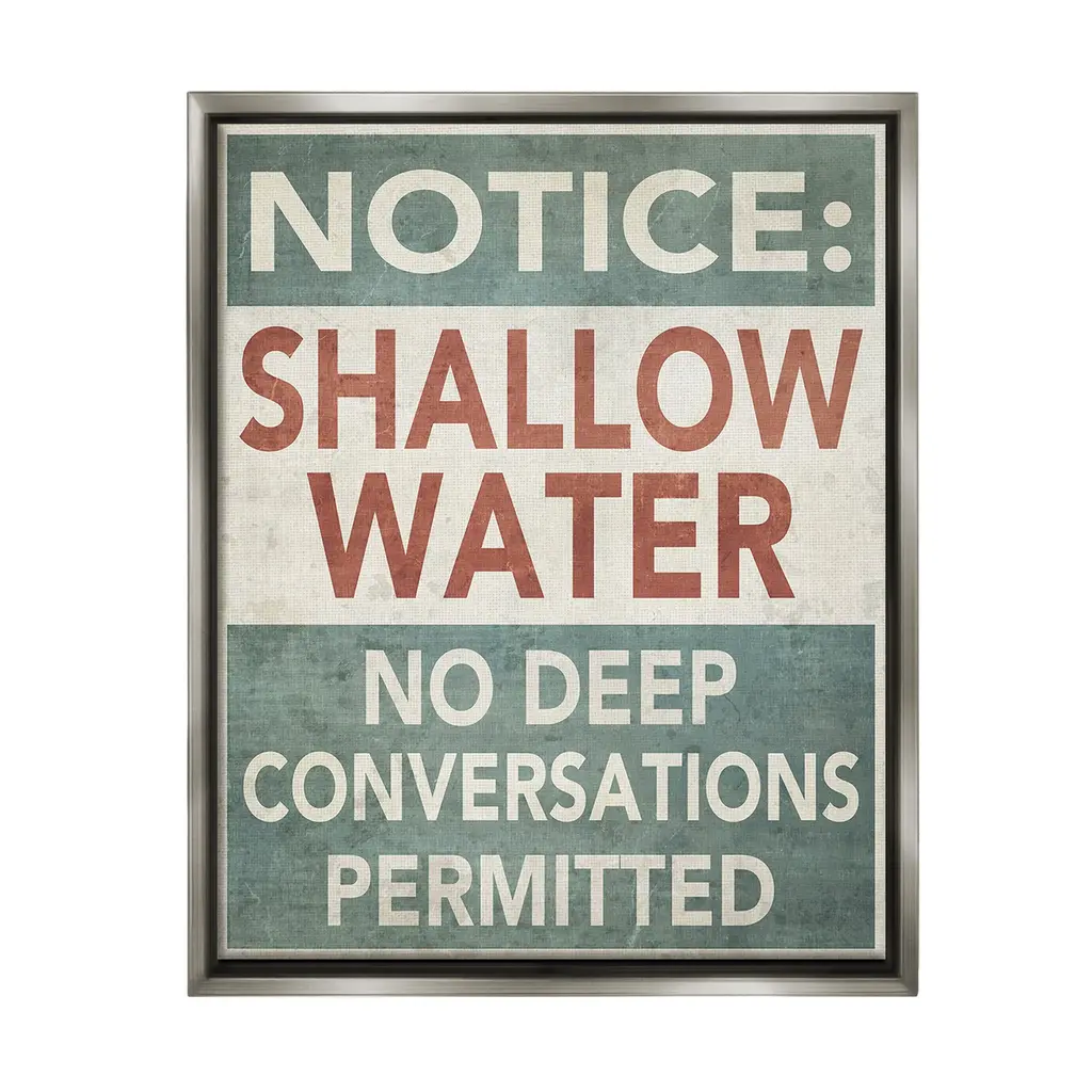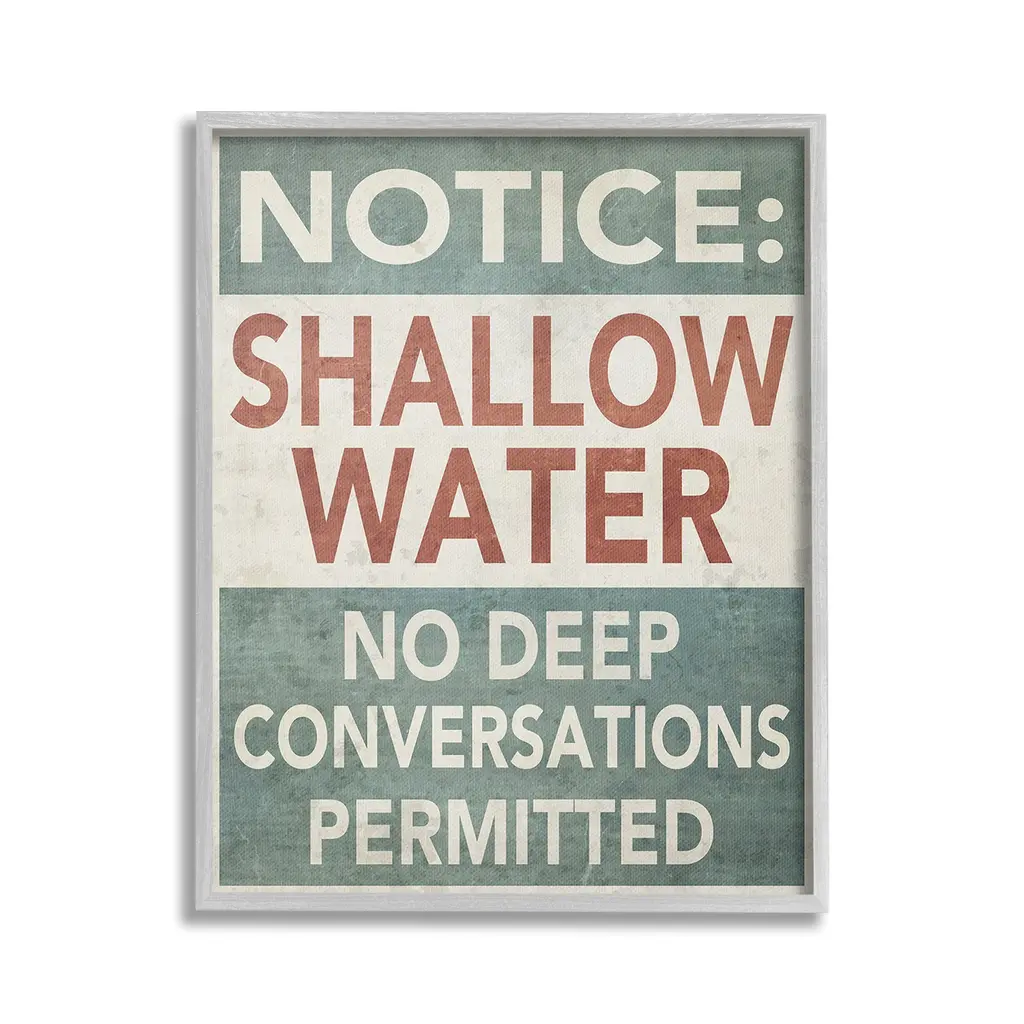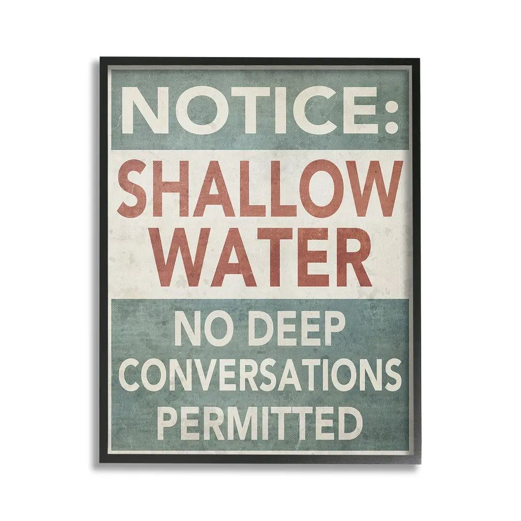 Add dimension to any room with our textured Framed Giclee Artwork. Our framed artwork is securely mounted into a 1.5-inch thick wood grain frame and ready to hang. Frames are available in three alluring styles: black, gray farmhouse and white. In addition, you should check out our oversized options if you want a statement piece. Stupell Wall Art is made in the USA.Features: Dimensions: 11 x 1.5 x 14 FramedFramed Giclee Products are available in the sizes 11"x14", 16"x20" or 24"x30". All Framed Giclee Products have a 1.5" Depth. Wall Art is Ready to Hang with Hardware Free Hanging. No installation required. For Easy Set Up Lean or Layer Artwork on Shelf or Against Wall.Our giclée prints are carefully mounted on a durable MDF backing, and then perfectly finished in a 1.5 inch thick woodgrain frame. Mounted frame colors include black, gray farmhouse and white. Made In USA.Artwork Relates To: Phrase, Humor, Nautical, Beach, Rustic, Vintage, Lake, Notice, Shallow Water No Deep Conversations PermittedDesign by GraffiTee Studios