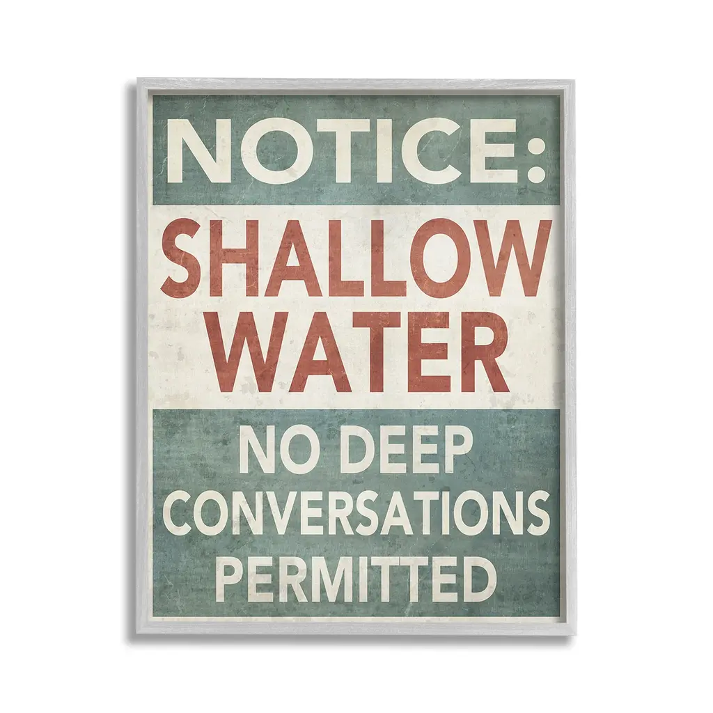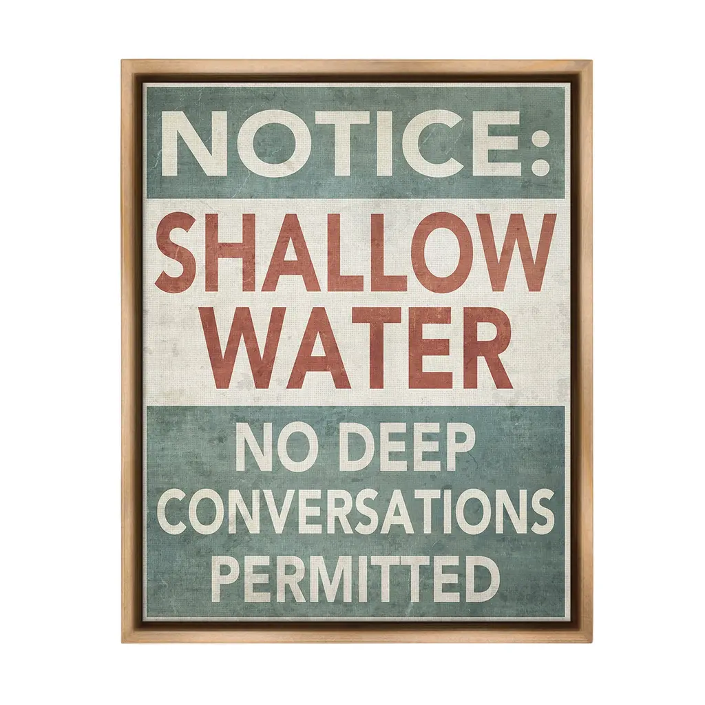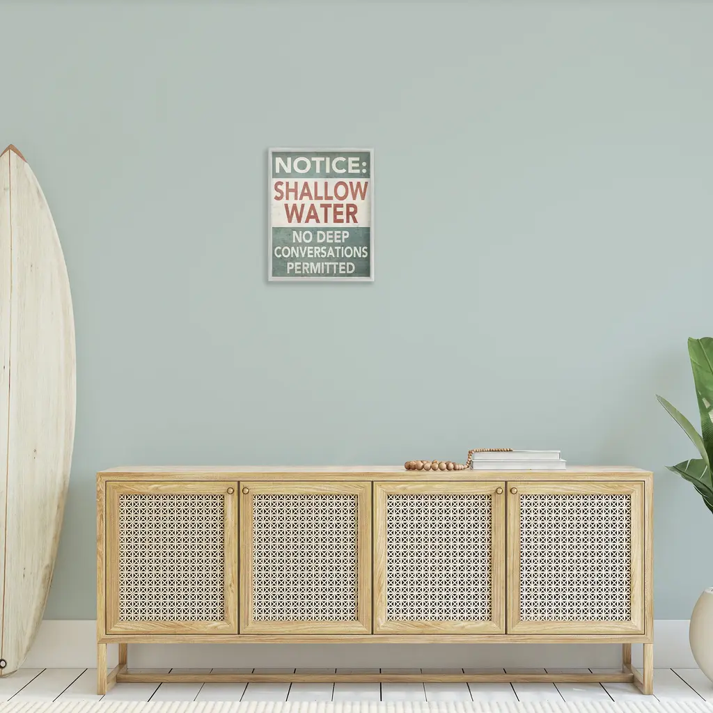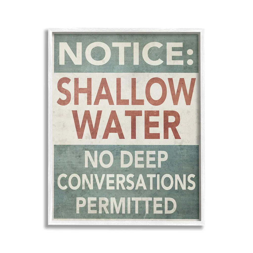 Add dimension to any room with our textured Framed Giclee Artwork. Our framed artwork is securely mounted into a 1.5-inch thick wood grain frame and ready to hang. Frames are available in three alluring styles: black, gray farmhouse and white. In addition, you should check out our oversized options if you want a statement piece. Stupell Wall Art is made in the USA.Features: Dimensions: 11 x 1.5 x 14 FramedFramed Giclee Products are available in the sizes 11"x14", 16"x20" or 24"x30". All Framed Giclee Products have a 1.5" Depth. Wall Art is Ready to Hang with Hardware Free Hanging. No installation required. For Easy Set Up Lean or Layer Artwork on Shelf or Against Wall.Our giclée prints are carefully mounted on a durable MDF backing, and then perfectly finished in a 1.5 inch thick woodgrain frame. Mounted frame colors include black, gray farmhouse and white. Made In USA.Artwork Relates To: Phrase, Humor, Nautical, Beach, Rustic, Vintage, Lake, Notice, Shallow Water No Deep Conversations PermittedDesign by GraffiTee Studios