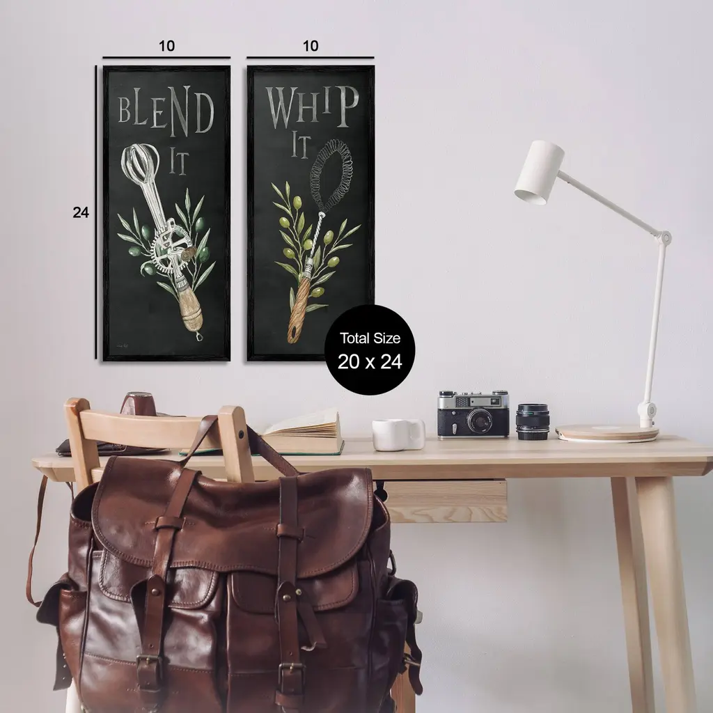 Fill any space in your home or office with our Framed Wall Art Sets. Our framed artwork is securely mounted into a 1.5-inch thick wood grain frame and ready to hang. Frames are available in three alluring styles: black, gray farmhouse and white. Stupell Wall Art is made in the USA.Features: Dimensions: 2 Piece Set, Each Panel is 10 x 1.5 x 24 FramedTwo Piece Framed Giclee Sets are available as 10"x24" or 13"x30" Panels. All Framed Giclee Panels have a 1.5" Depth. Wall Art is Ready to Hang with Hardware Free Hanging. No installation required. For Easy Set Up Lean or Layer Artwork on Shelf or Against Wall.Curated Wall Art Sets make it easy for you complete the theme for any room. Our giclée prints are carefully mounted on a durable MDF backing, and then perfectly finished in a 1.5 inch thick woodgrain frame. Mounted frame colors include black, gray farmhouse and white. Made In USA.Artwork Relates To: Kitchen, Herb, Vintage, Sign, Plant, Botanical, Leaf, Blend It, Whip ItDesign by Cindy Jacobs