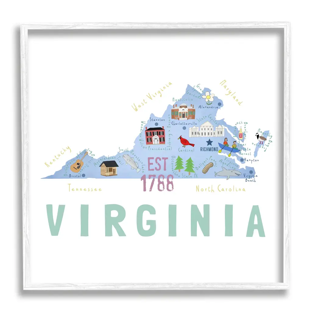 Add dimension to any room with our textured Framed Giclee Artwork. Our framed artwork is securely mounted into a 1.5-inch thick wood grain frame and ready to hang. Frames are available in three alluring styles: black, gray farmhouse and white. In addition, you should check out our oversized options if you want a statement piece. Stupell Wall Art is made in the USA.Features: Dimensions: 12 x 1.5 x 12 FramedFramed Giclee Sizes Include Standard: 12 x 1.5 x 12 Large: 17 x 1.5 x 17 Oversized: 24 x 1.5 x 24Wall Art is Ready to Hang - No Installation or Hardware Needed. For Easy Set Up Lean or Layer Artwork on Shelf or Against Wall.Our giclée prints are carefully mounted on a durable MDF backing, and then perfectly finished in a 1.5 inch thick woodgrain frame. Mounted frame colors include black, gray farmhouse and white. Made In USA.Artwork Relates To: USA, State, Landmarks, Map, Diagram, VirginiaDesign by Carla Daly
