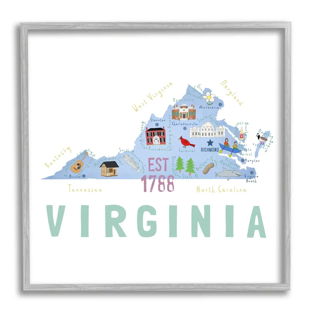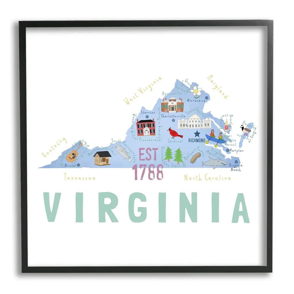 Add dimension to any room with our textured Framed Giclee Artwork. Our framed artwork is securely mounted into a 1.5-inch thick wood grain frame and ready to hang. Frames are available in three alluring styles: black, gray farmhouse and white. In addition, you should check out our oversized options if you want a statement piece. Stupell Wall Art is made in the USA.Features: Dimensions: 12 x 1.5 x 12 FramedFramed Giclee Sizes Include Standard: 12 x 1.5 x 12 Large: 17 x 1.5 x 17 Oversized: 24 x 1.5 x 24Wall Art is Ready to Hang - No Installation or Hardware Needed. For Easy Set Up Lean or Layer Artwork on Shelf or Against Wall.Our giclée prints are carefully mounted on a durable MDF backing, and then perfectly finished in a 1.5 inch thick woodgrain frame. Mounted frame colors include black, gray farmhouse and white. Made In USA.Artwork Relates To: USA, State, Landmarks, Map, Diagram, VirginiaDesign by Carla Daly