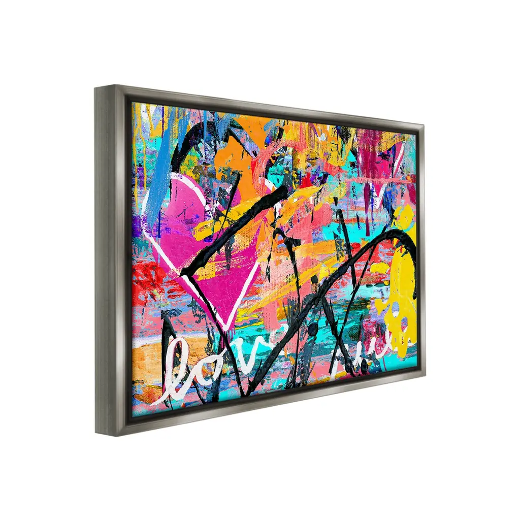 Elevate your home or office to the next level with Stupell Framed Floating Canvas Wall Art. Our premium hand-stretched canvas is mounted securely into a sturdy lightweight frame. The museum-style gap between the wrapped canvas and the box frame gives the illusion of floating artwork. Stupell Wall Art is made in the USA.Features: Dimensions: 21 x 1.7 x 17 Frame, 20 x 1.5 x 16 Canvas ArtFloating Frame Canvas Products are available in sizes 21"x17" and 31"x25". All Floating Frame Canvas Products have a 1.7" Depth.Wall Art is Ready to Hang with Hardware Free Hanging. No Installation required. For Easy Set Up Lean or Layer Artwork on Shelf or Against Wall. Artwork is Permently Fixed into the Frame.Our elevated 1.7" Thick Floating Frame is the perfect complement to our canvas style Wall Art. We use only the highest quality inks in house with industry leading printing solutions. Canvas is hand stretched over a durable wood foundation and then mounted securly into a Modern Box Frame. Made in the USA.Artwork Relates To: Abstract, Modern, Urban, Graffiti, Heart, Symbol, Love, Collage, Bold, VividDesign by Madeline Blake