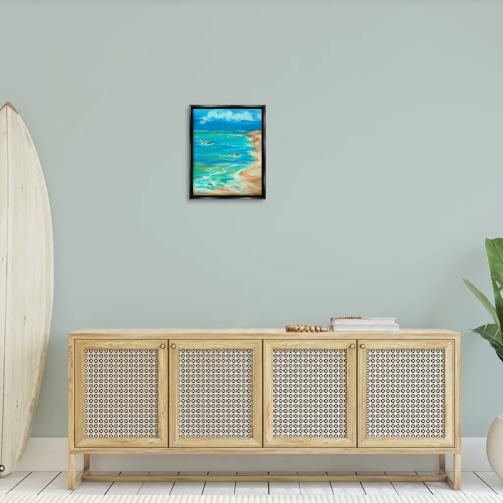 Elevate your home or office to the next level with Stupell Framed Floating Canvas Wall Art. Our premium hand-stretched canvas is mounted securely into a sturdy lightweight frame. The museum-style gap between the wrapped canvas and the box frame gives the illusion of floating artwork. Stupell Wall Art is made in the USA.Features: Dimensions: 17 x 1.7 x 21 Frame, 16 x 1.5 x 20 Canvas ArtFloating Frame Canvas Products are available in sizes 17"x21" and 25"x31". All Floating Frame Canvas Products have a 1.7" Depth.Wall Art is Ready to Hang with Hardware Free Hanging. No Installation required. For Easy Set Up Lean or Layer Artwork on Shelf or Against Wall. Artwork is Permently Fixed into the Frame.Our elevated 1.7" Thick Floating Frame is the perfect complement to our canvas style Wall Art. We use only the highest quality inks in house with industry leading printing solutions. Canvas is hand stretched over a durable wood foundation and then mounted securly into a Modern Box Frame. Made in the USA.Artwork Relates To: Painting, Scenery, Horizon, Cloud, Sea, Water, Shore, Coast, Rocks, CliffDesign by Liz Jardine